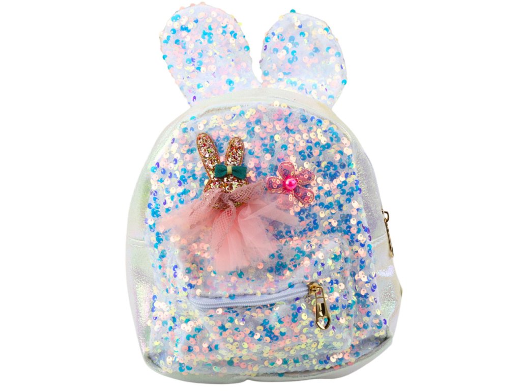 Detský batoh bílý s flitry a zaječími ušima 4,4L je stylový a praktický doplněk pro každou malou milovnici třpytu Jeho jedinečný vzhled, třpytivé flitry a ozdobné detaily přitahují pozornost a dodávají šarm každému outfitu
