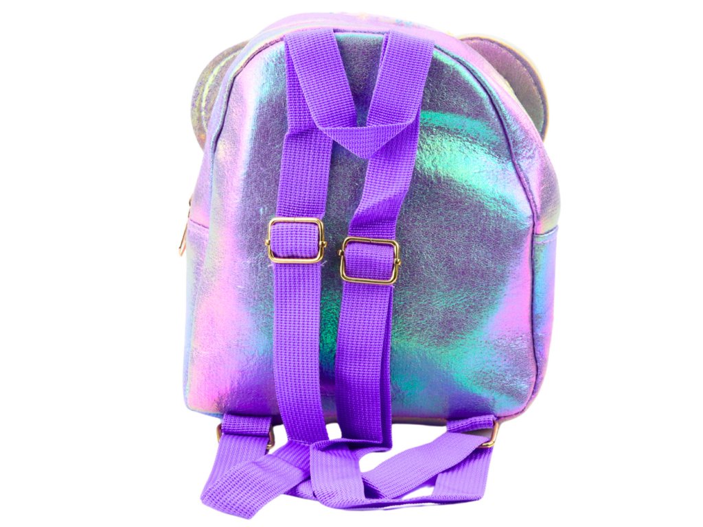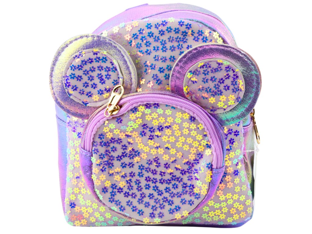 - Fialový Tento roztomilý dětský batoh s motivem myšky a třpytivými flitry je vynikající volbou pro holčičky, které si cení barevného a jedinečného stylu