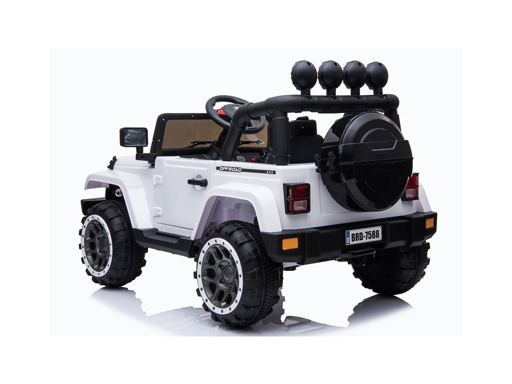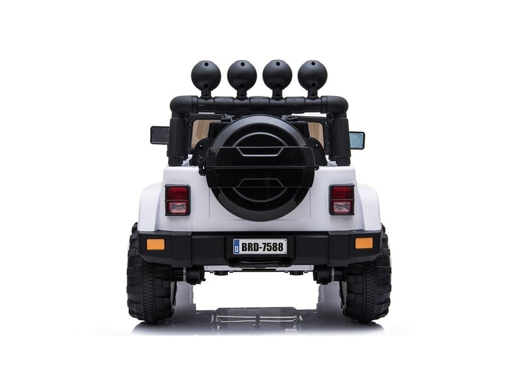 Velkou výhodou bílého modelu džípu BRD-7588 je rukojeť skrytá pod spodkem vozidla, která usnadňuje přepravu vozidla v nouzové situaci, například při vybití baterie, a také otevíratelný úložný prostor v zadní části vozidla ve formě náhradního kola. Dítě si tam může uložit své nezbytné cestovní doplňky.