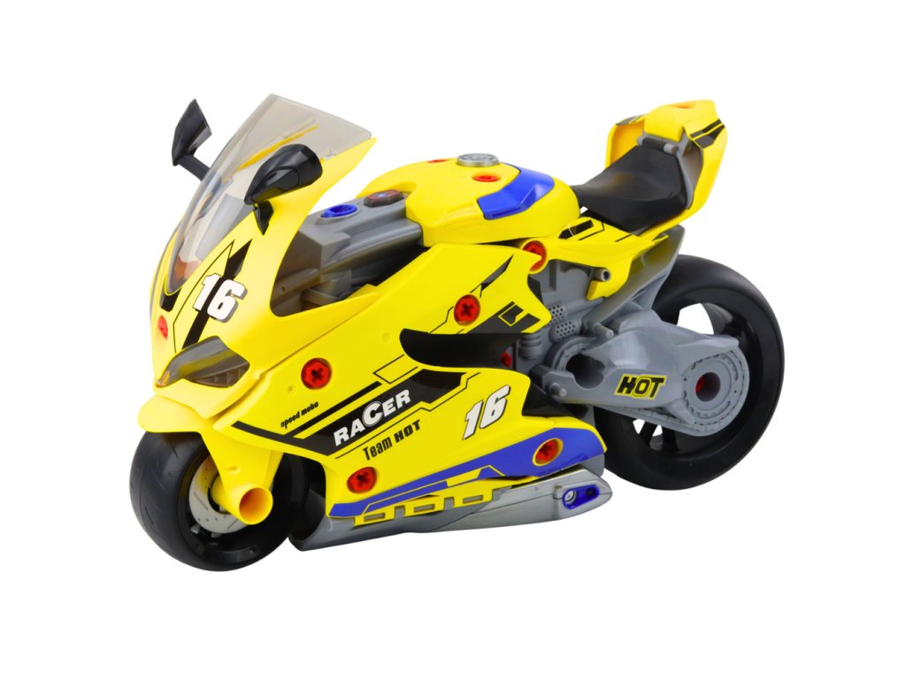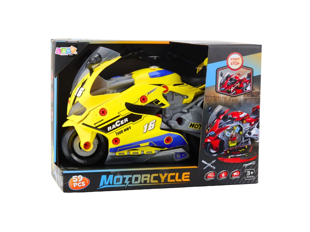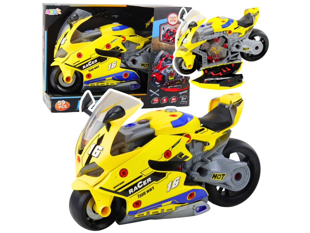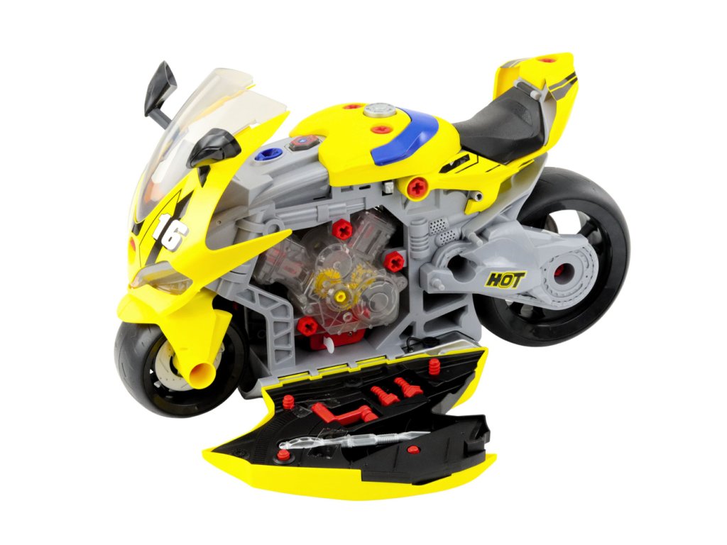 Celý motocykl lze snadno přemístit díky praktické rukojeti a díky velkým pohyblivým kolům se snadno ovládá. Produkt obsahuje vše potřebné: klíče, šroubky a dekorativní nálepky, které podporují kreativní montáž a demontáž jednotlivých dílů.