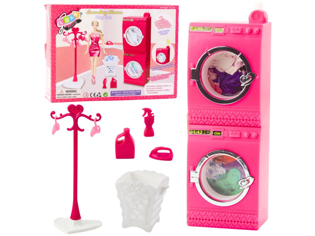 Všechny detaily jsou pečlivě navrženy tak, aby co nejvěrněji připomínaly skutečnou prádelnu, což dětem umožňuje rozvíjet fantasii, koordinaci rukou a dovednosti v roli. Náš set také obsahuje imitace detergentů a sadu věšáků, které pomáhají udržet pořádek v šatně panenek.
