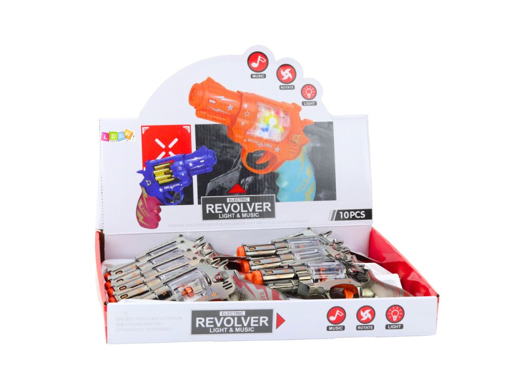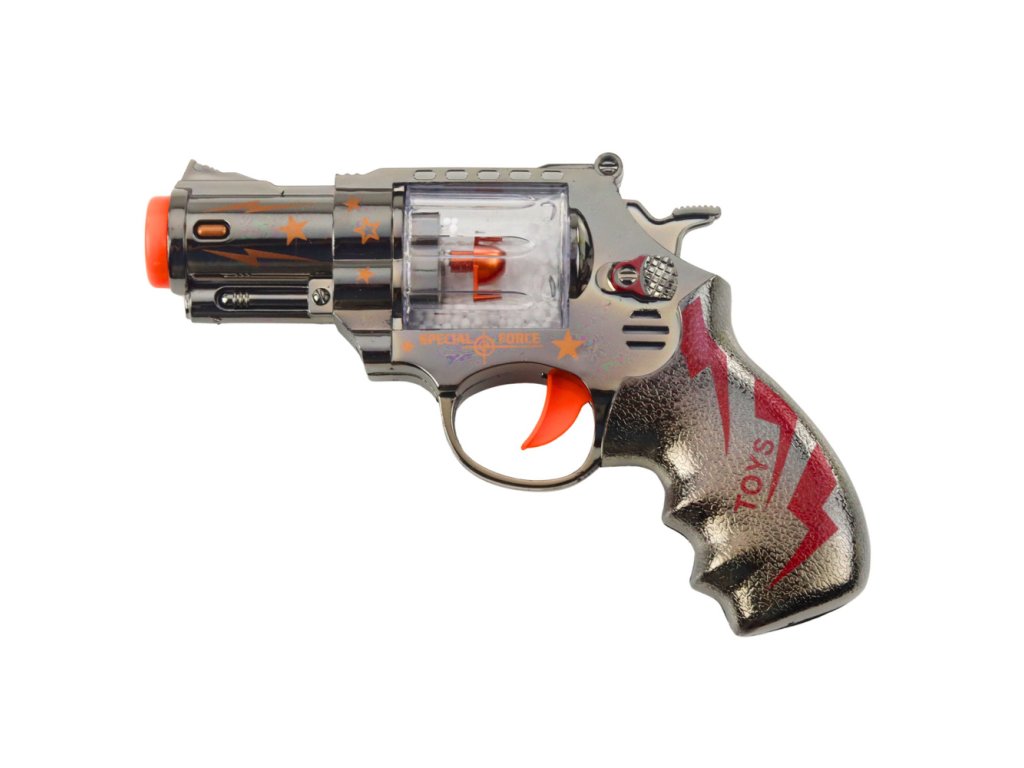 - Obsah balení: Hračkový revolver s efekty a návod k použití.