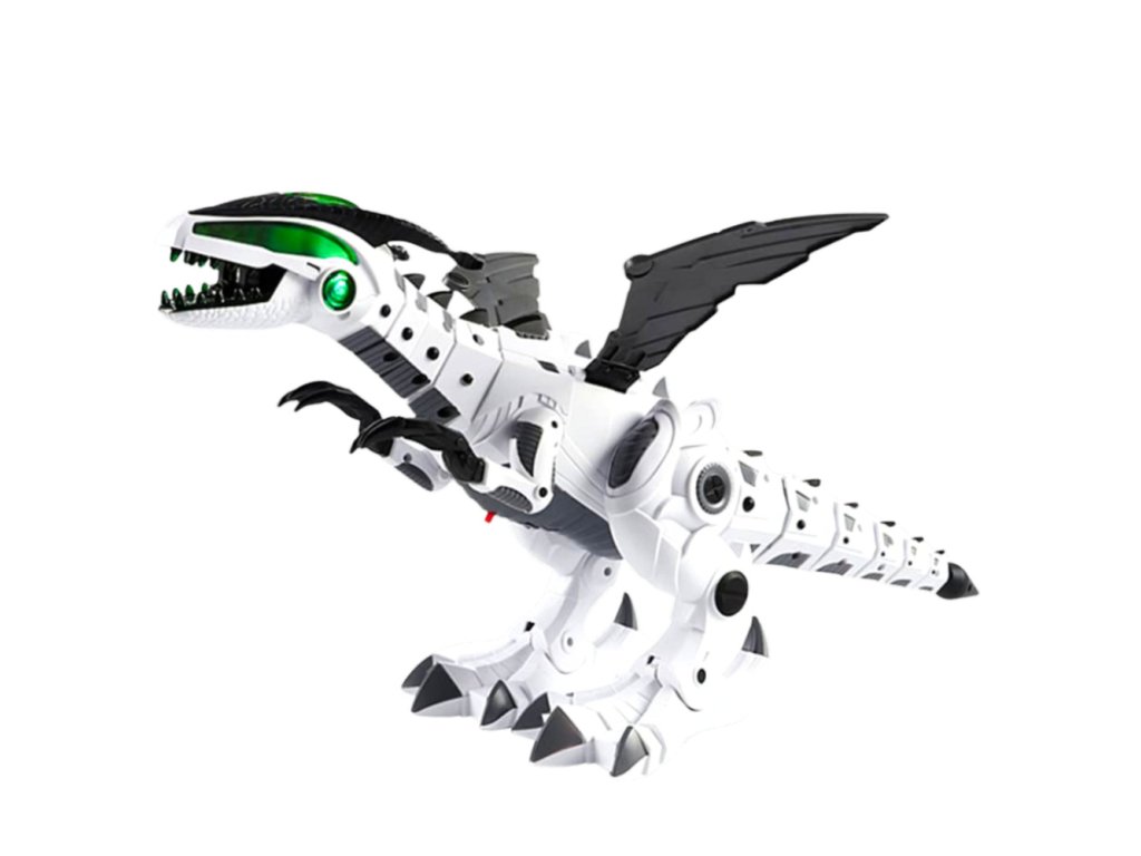 - Tento úžasný robot dinozaur kombinuje futuristický design v bílo-černém provedení s výraznými zelenými světelnými akcenty, což z něj činí ideálního společníka pro každé dítě