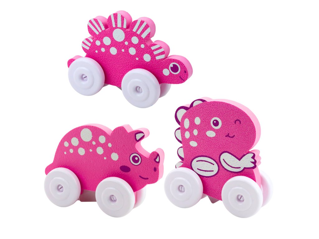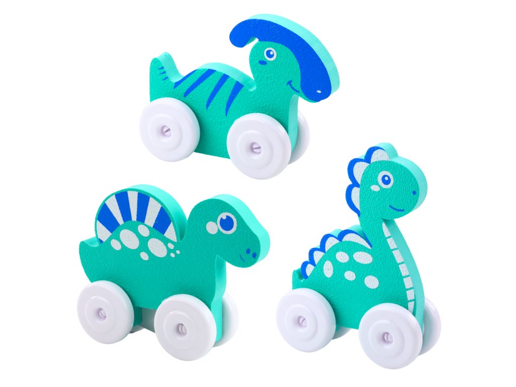 Každý dinosaurus má přátelský vzhled, zaoblené tvary a pastelové barvy, které přitahují pozornost a povzbuzují ke hře Díky kolečkům se hračky volně pohybují a lehká konstrukce umožňuje dítěti snadno je tlačit a brát s sebou všude