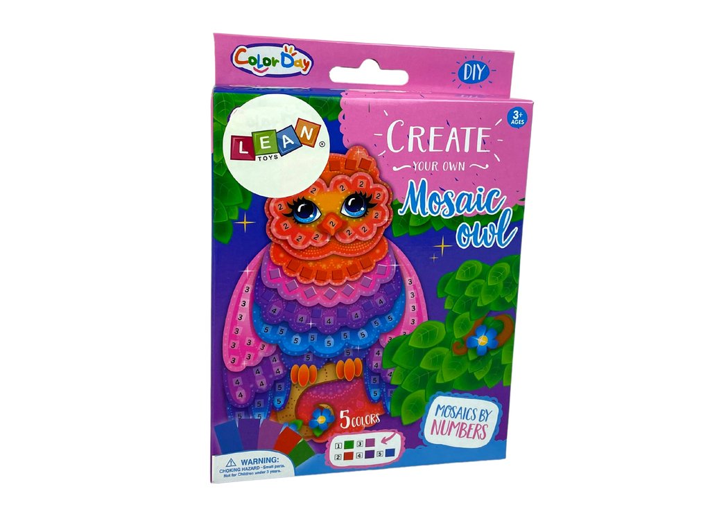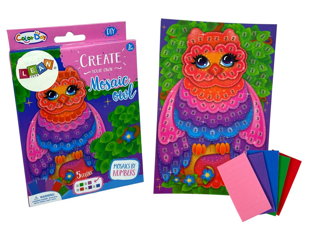 - Sada pro vlastní výrobu barevné mozaiky s motivem sovy Samolepící mozaika je ideální forma trávení volného času, která spočívá v vyplňování hotového vzoru z obrázku malými čtverečky