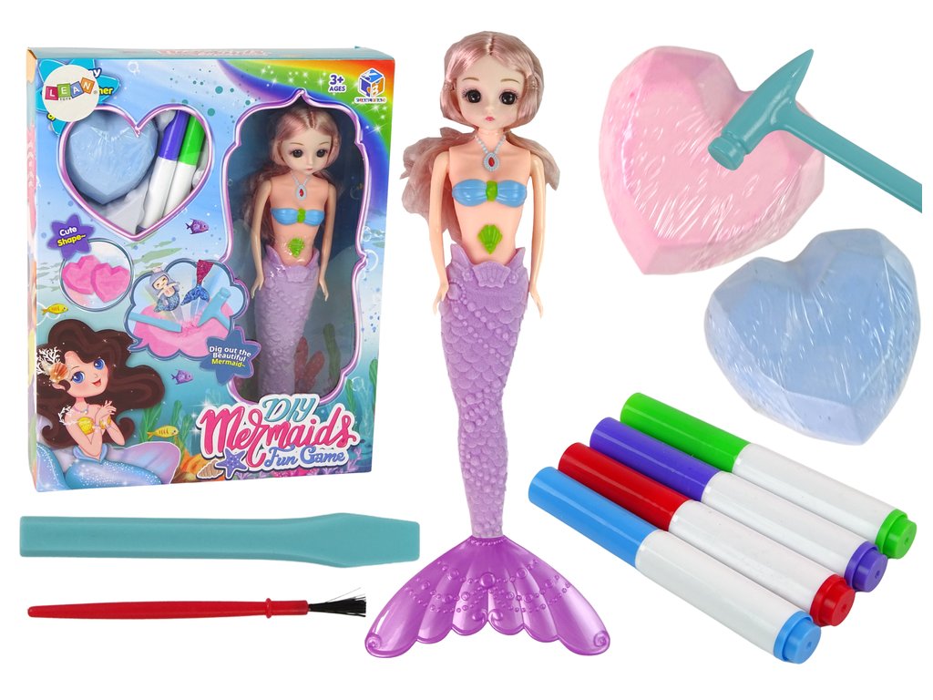 DIY sada Siréna fialová Poklady z vykopávek Vícečlenná sada s mořskou pannou rozvine kreativitu a představivost vašeho dítěte Hrajte si se svou malou mořskou pannou, ozdobte jí ocas a objevte, co se skrývá v malých kamíncích ve tvaru srdce