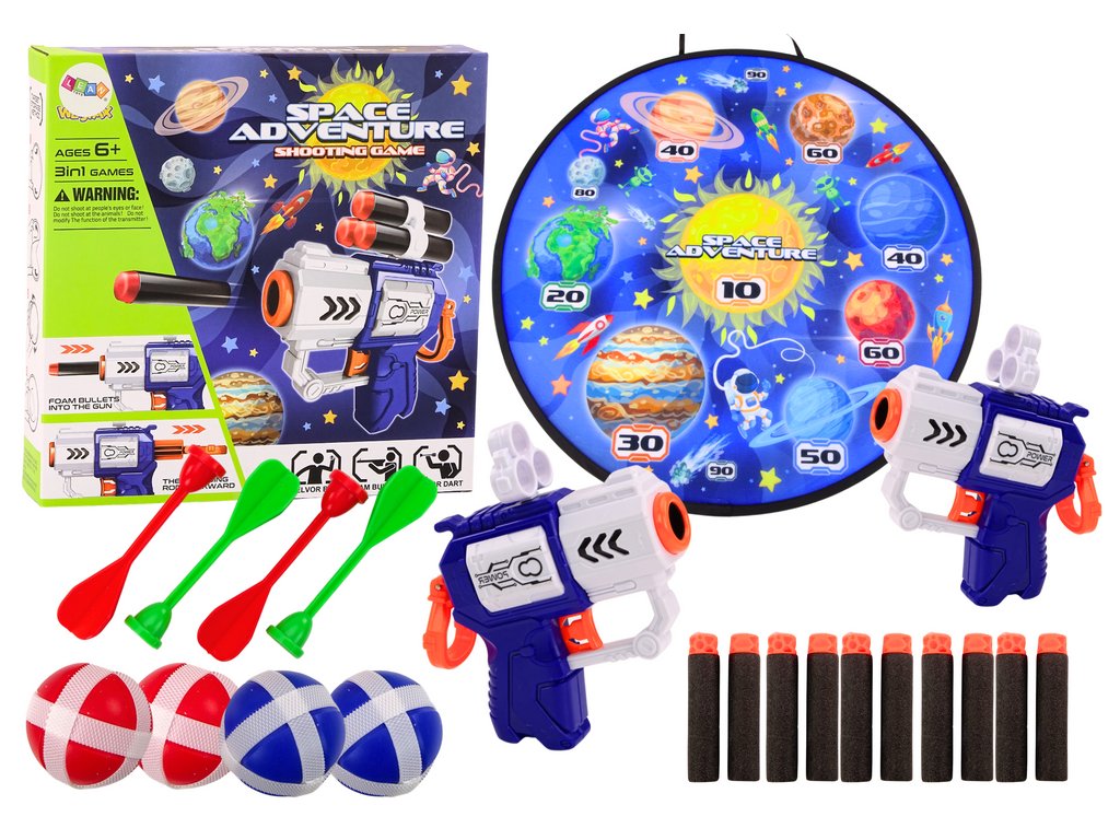 Dovednostní hra: Kosmická deska, pistole, šipky, kuličky