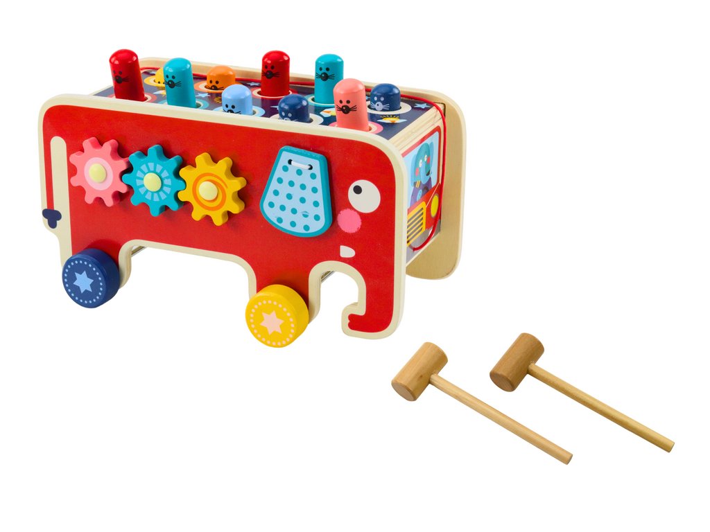 Doplněk: Ozubená kolečka umístěná na straně autíčka, která můžete otáčet, přináší do hry interaktivní a poutavý prvek. Sada je kompletní a obsahuje autíčko s provázkem na tahání a 2 kladiva pro hru Whac-a-Mole. Hračka je vyrobena z bezpečného dřeva, což zajišťuje odolnost a bezpečí pro děti.