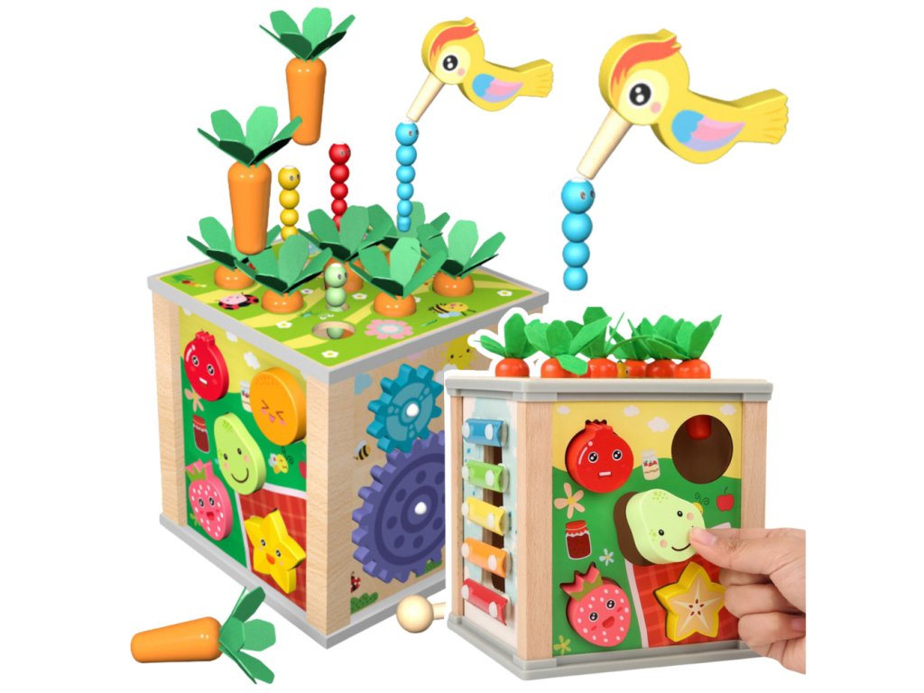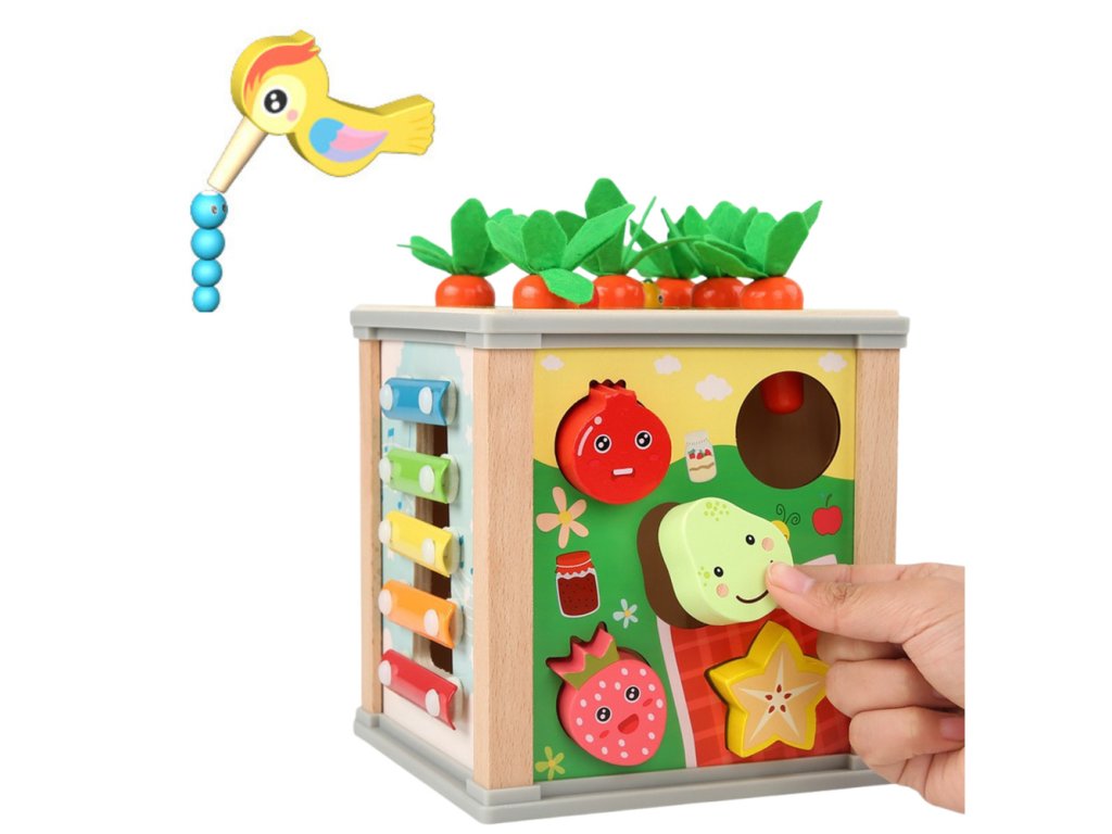 Představujeme vám dřevěnou edukační smyslovou multifunkční kostku 6v1, která je navržena tak, aby rozveselila a zabavila vaše dítě na dlouhé hodiny Tato fantastická edukační hračka obsahuje šest různých aktivit, jako je vytahování mrkví, párování tvarů, hudební xylofon, ozubená kola a hodiny učící čas