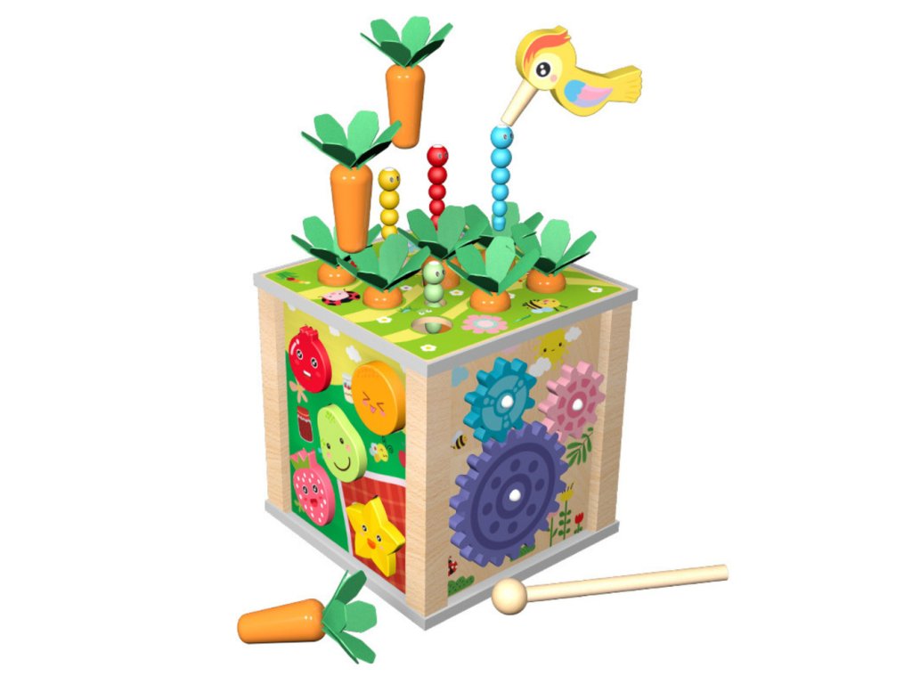 - Tato fantastická edukační hračka obsahuje šest různých aktivit, jako je vytahování mrkví, párování tvarů, hudební xylofon, ozubená kola a hodiny učící čas