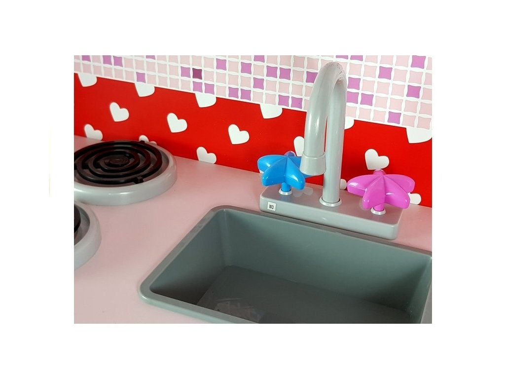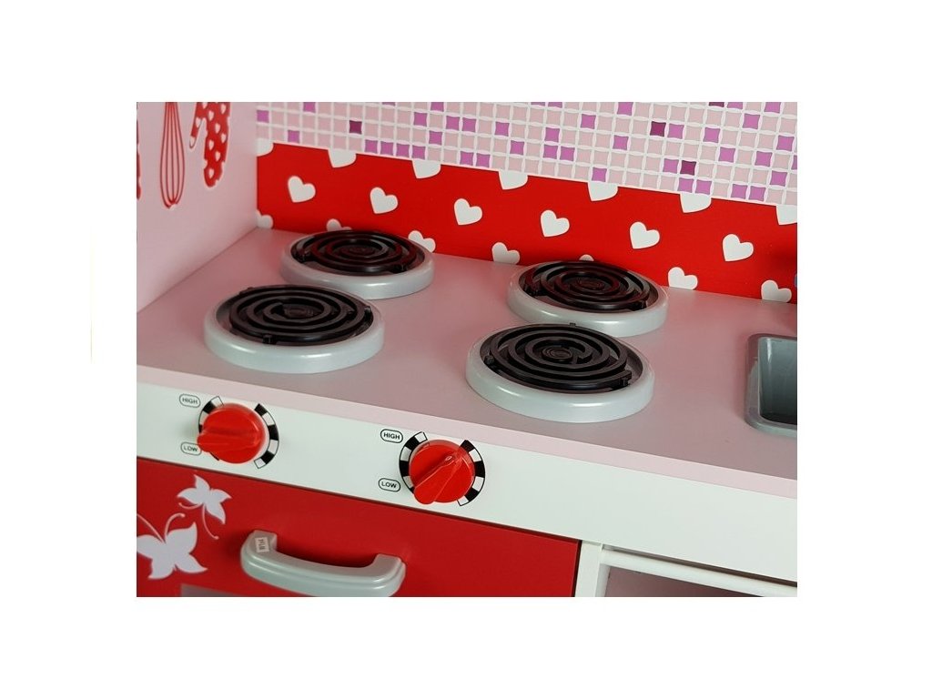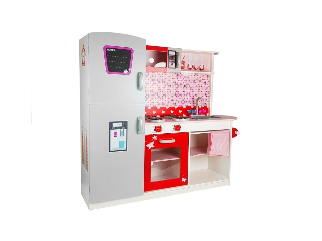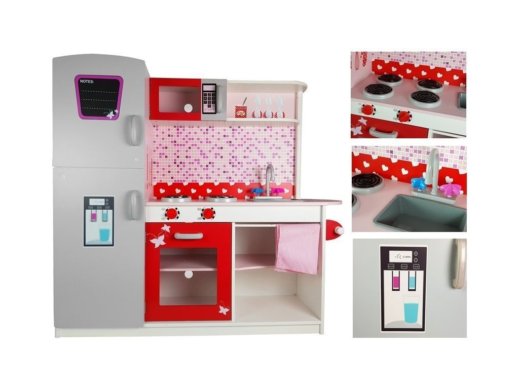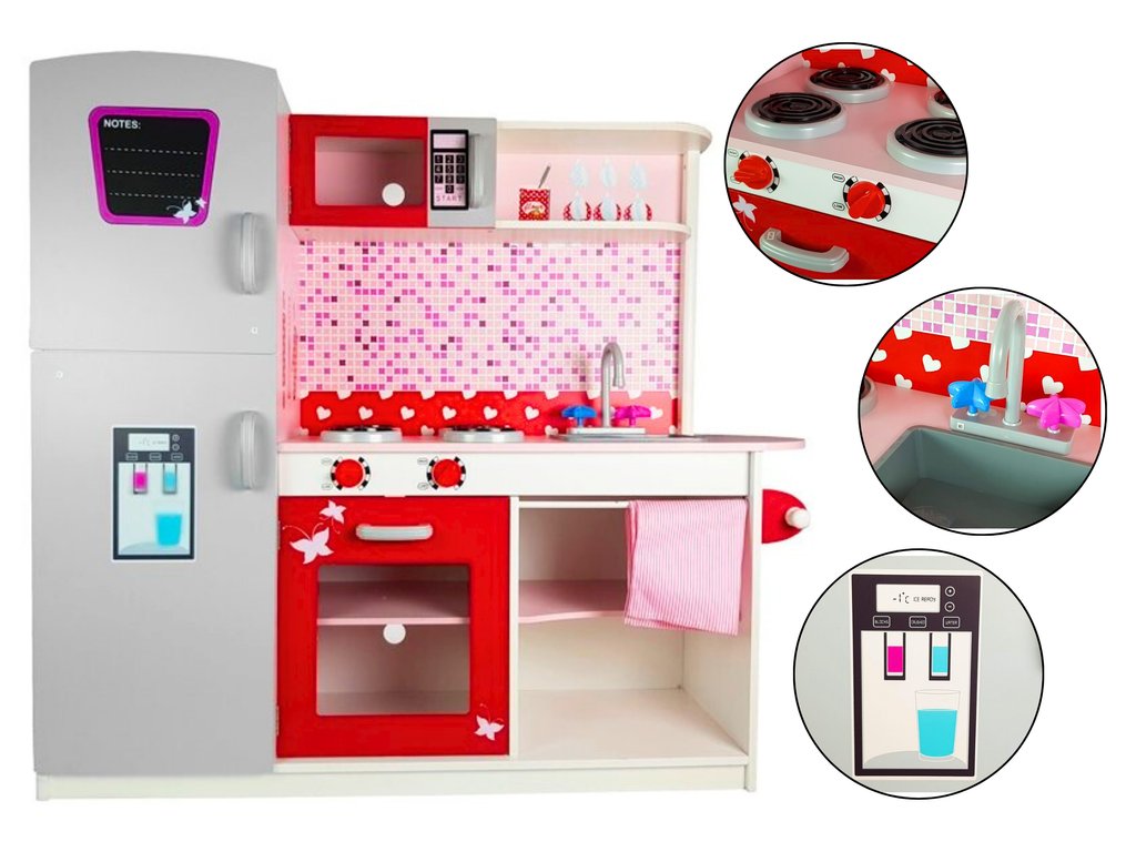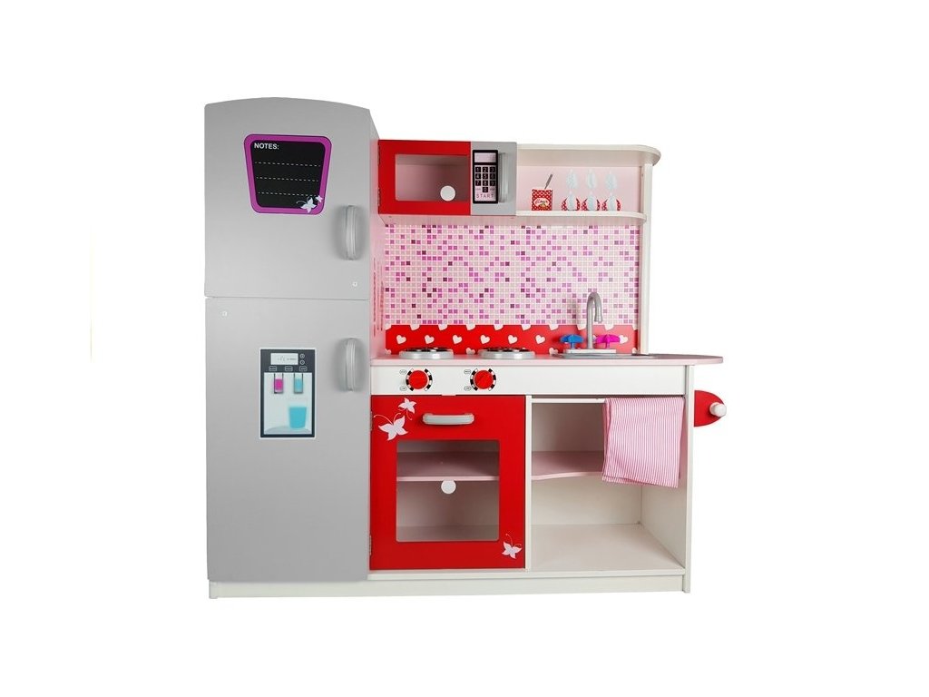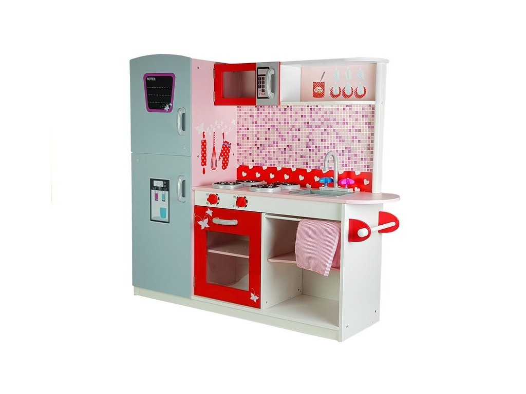 - Dřevěná kuchyňka s mikrovlnnou troubou, lednicí a plynovým sporákem je jedinečným místem pro hraní a učení, vytvořená s ohledem na malé kuchaře