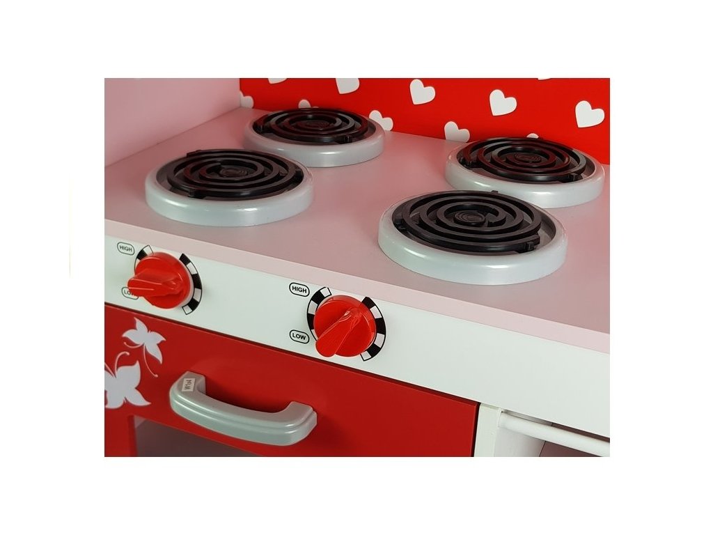 Dřevěná kuchyňka Jola Lednička Mikrovlnná trouba Otevíratelné prvky Kuchyně je vybavena lednicí, dřezem, troubou, 4 plotýnkami, policí, mikrovlnnou troubou a držákem na papírové utěrky.