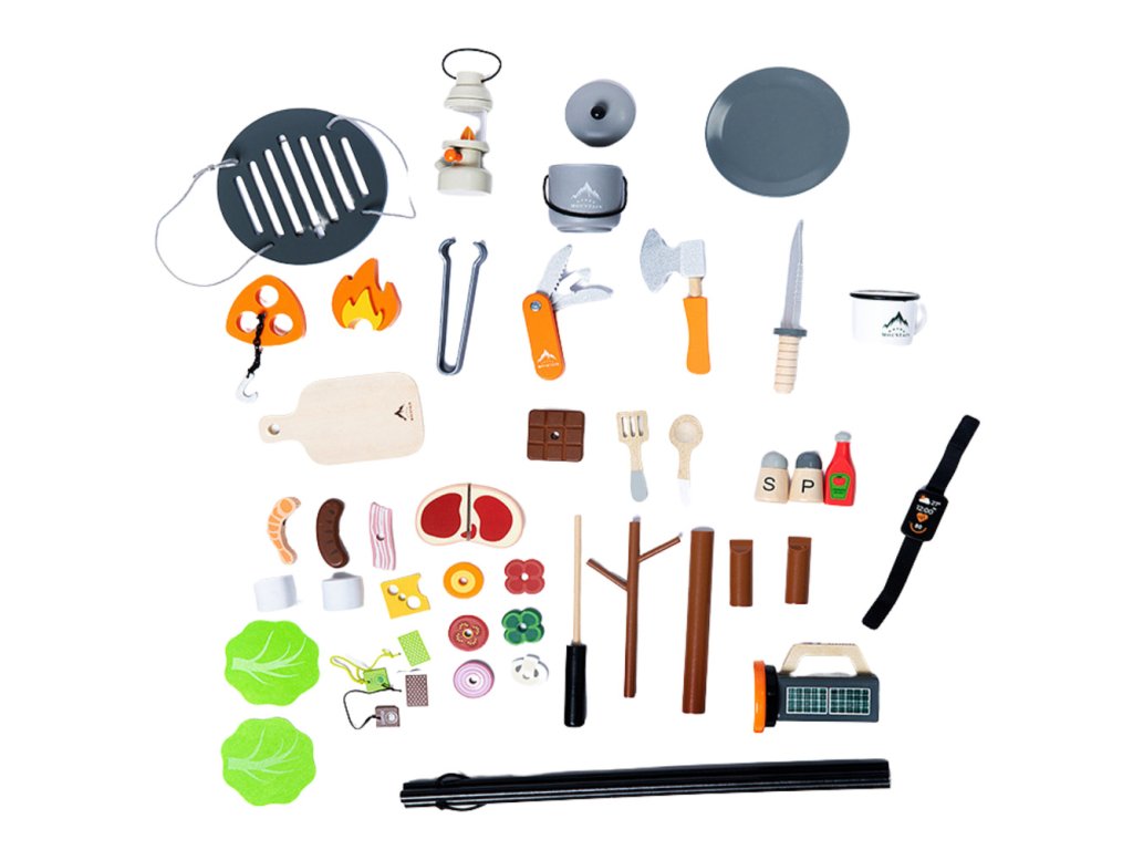 Tato dřevěná sada na kempování je ideální dobrodružnou zábavou pro děti, která jim umožní cítit se jako opravdoví průzkumníci Obsahuje všechny nezbytné doplňky k vytvoření vlastního tábora, jako je batoh, svítilna, nůž, sekera, místo na ohniště a mnoho dalšího