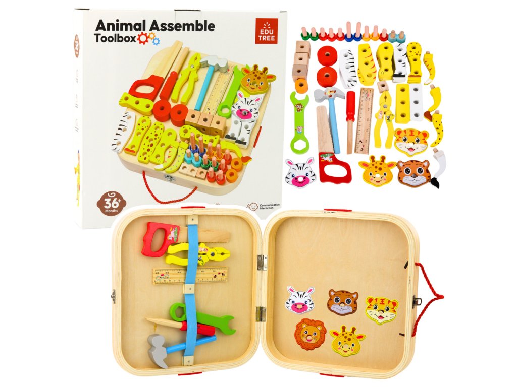 Dřevěná sada pro malé kutily – zvířata na šroubování v kufříku, 59 ks