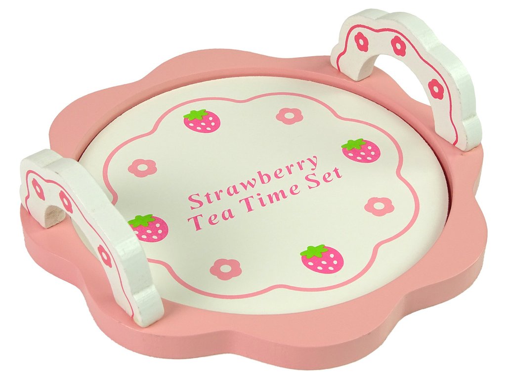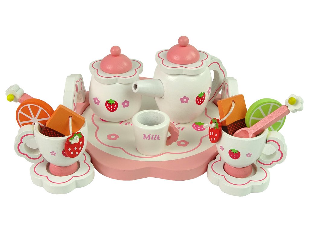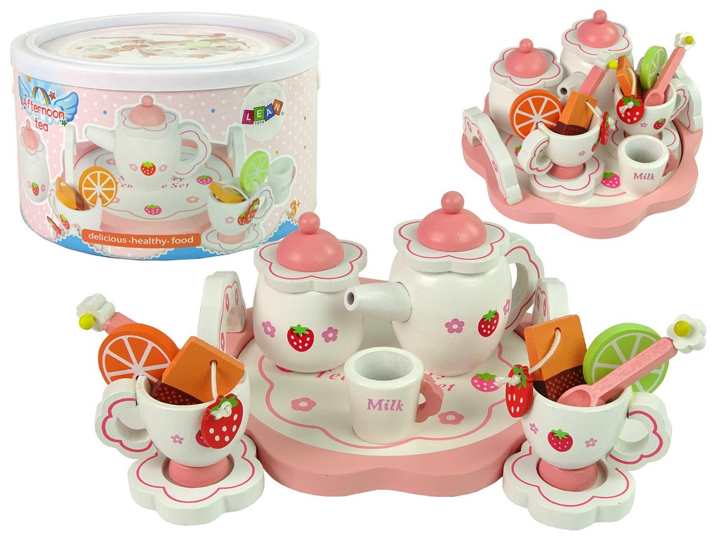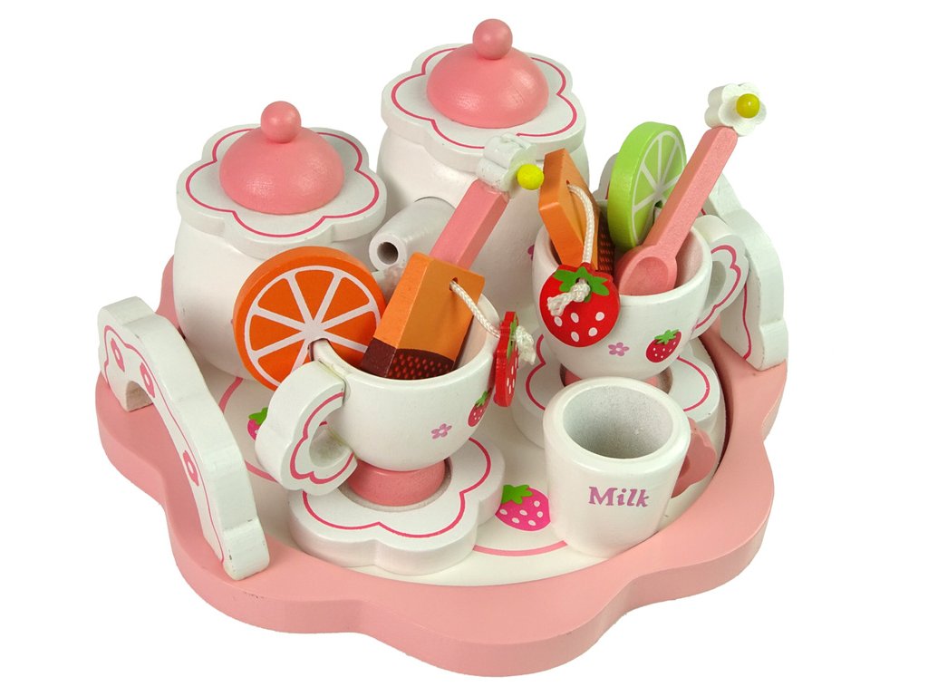 Dřevěná sada na čaj s růžovými kvítky, konvice a podnos Děti milují narozeninové oslavy a večírky.