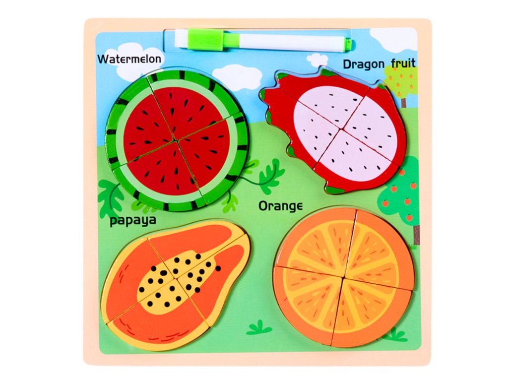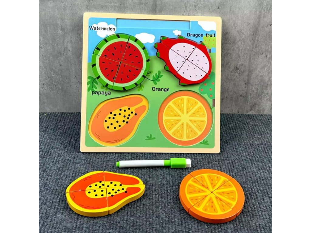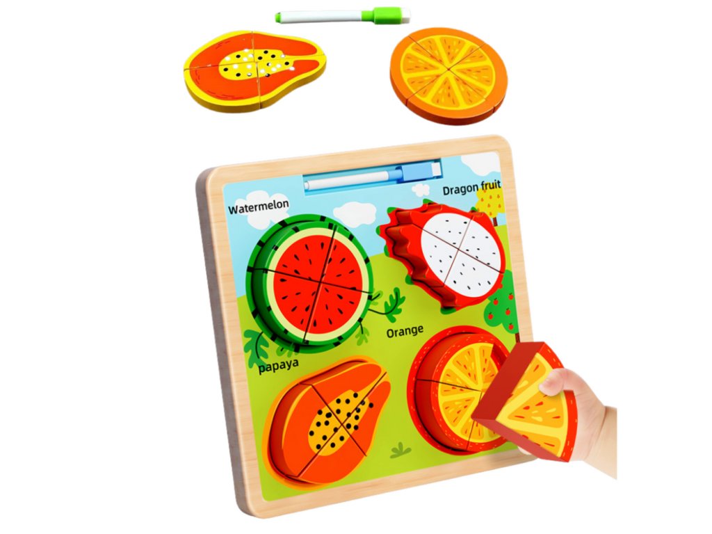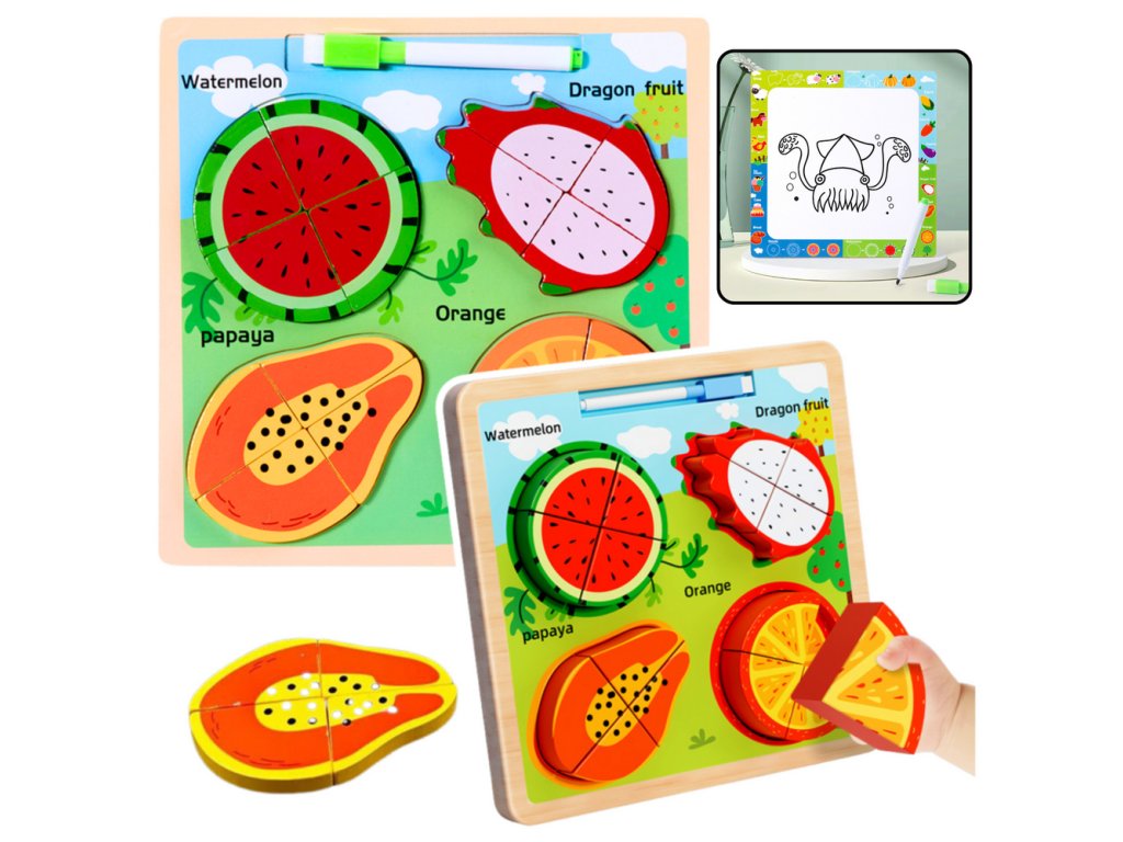 Každé ovoce je rozděleno na několik částí, které je třeba správně umístit, což podporuje rozvoj koordinace a logického myšlení Výjimečnou vlastností této hračky je povrch na kreslení, umístěný na zadní straně desky, který umožňuje dítěti kreslit a psát za pomoci přiloženého suchého mažícího fixu