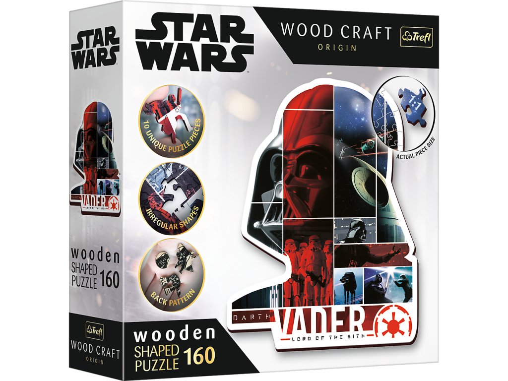 Dřevěné puzzle Darth Vader je výjimečná nabídka pro fanoušky Hvězdných válek Tyto atmosférické puzzle se skládají z 160 prvků, včetně 10 unikátních figurek puzzle inspirovaných světem Star Wars