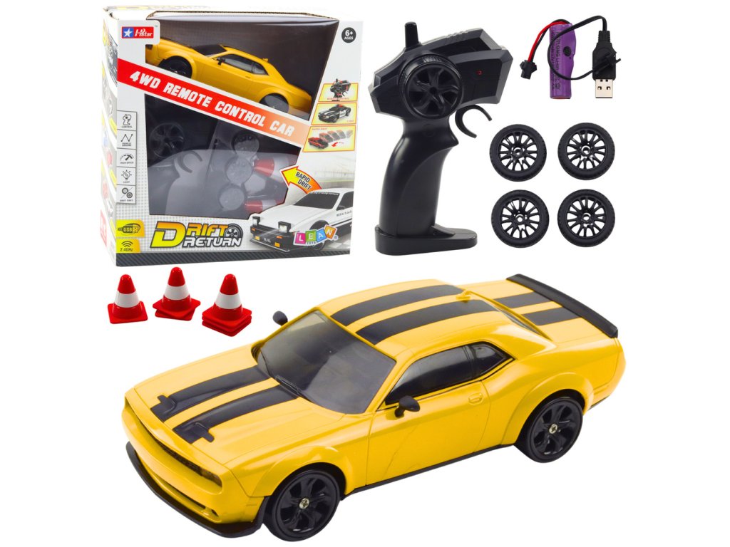 Driftovací RC auto 4WD žluté s černými pruhy Zdalně ovládané driftovací auto 4WD je dynamická a přesná hračka, která poskytuje nezapomenutelné emoce během jízdy Model inspirovaný moderními sportovními automobily nabízí realistické detaily, vynikající přilnavost a možnost provádění kontrolovaných smyků