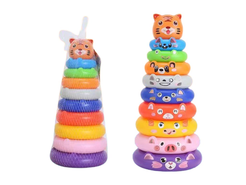 - Pyramida z kroužků s nálepkami zvířátek tygra je barevná hračka, která kombinuje vzdělávání a kreativitu