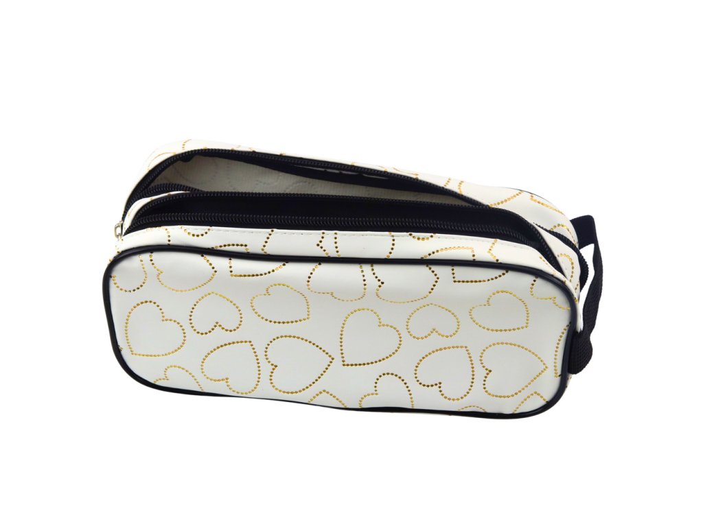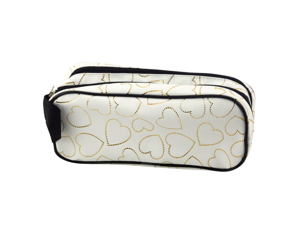 - Toto stylové pouzdro s motivem zlatých srdcí na intenzivně bílém podkladu je ideálním doplňkem pro každou studentku, která si potrpí na moderní design a pořádek
