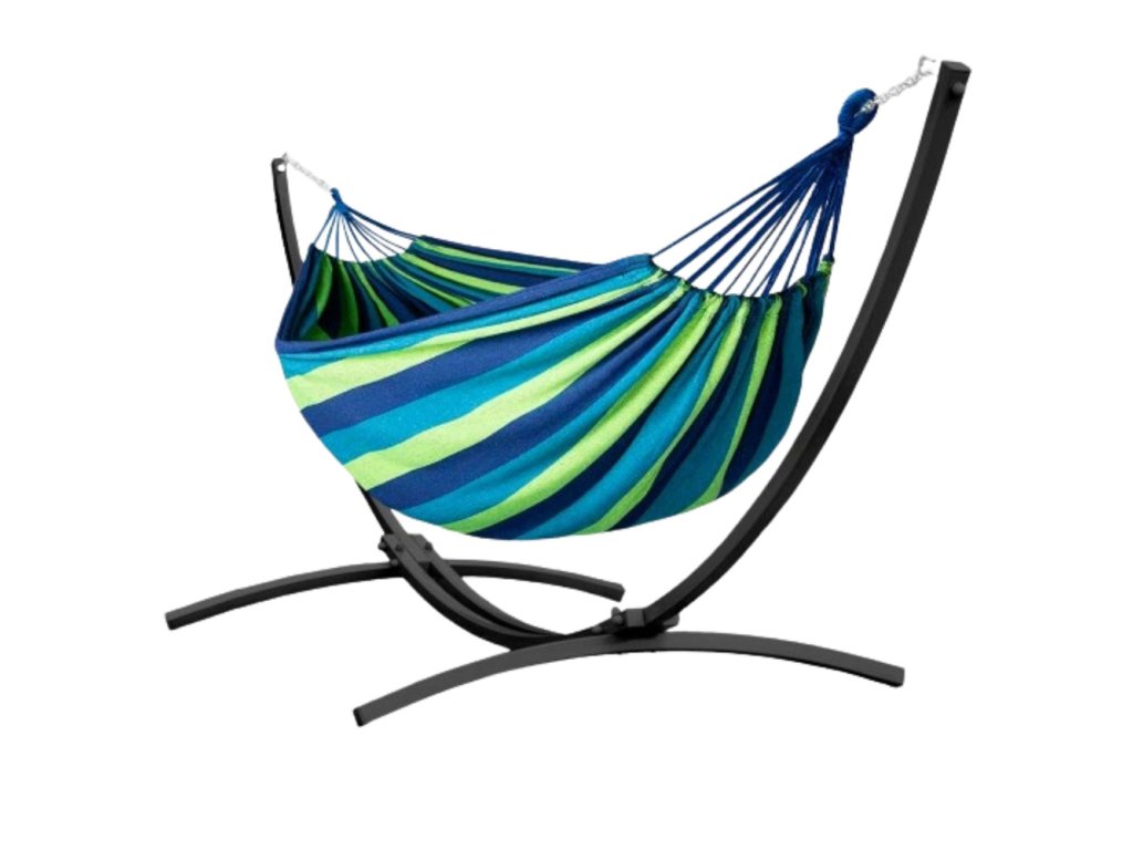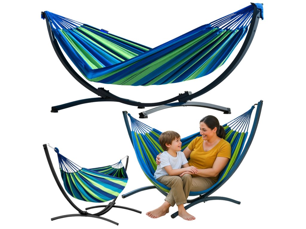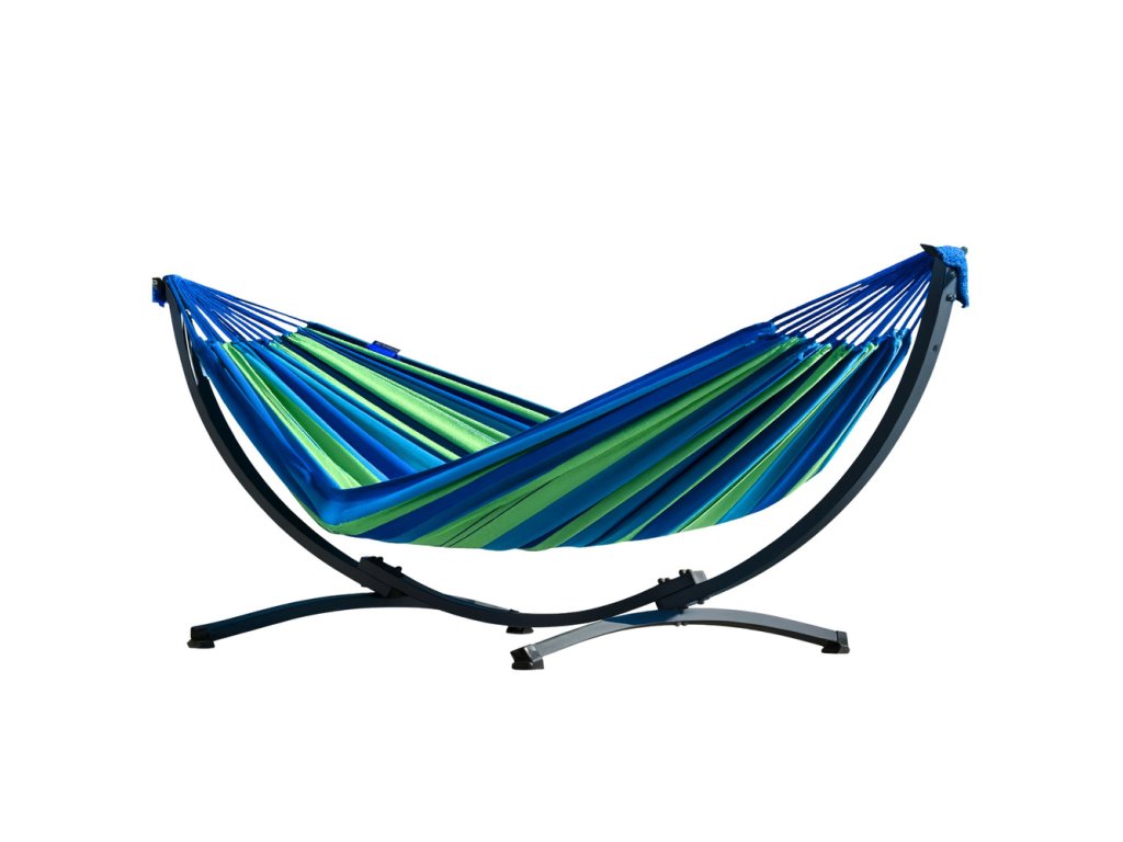 - KOMPAKTNÍ ZAHRADNÍ HOUPACÍ SÍŤ 200X120 ZELENO-MODRÁ SE STOJANEM Kompletní houpací sada skládající se z pevného ocelového stojanu a velké, pohodlné sítě v zeleno-modré barvě
