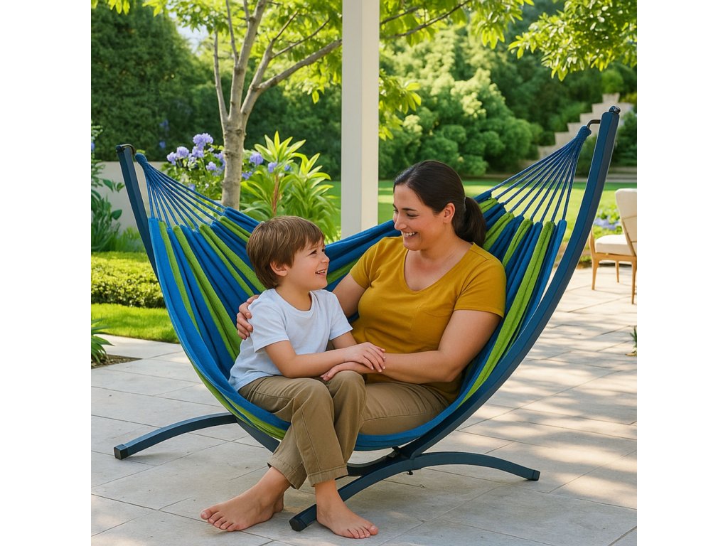 - Pokud hledáte dokonalou kombinaci pohodlí a stylu pro vaši zahradu, dvouosý zahradní houpací síť se stojanem v zeleno-modré barvě je přesně to, co potřebujete!