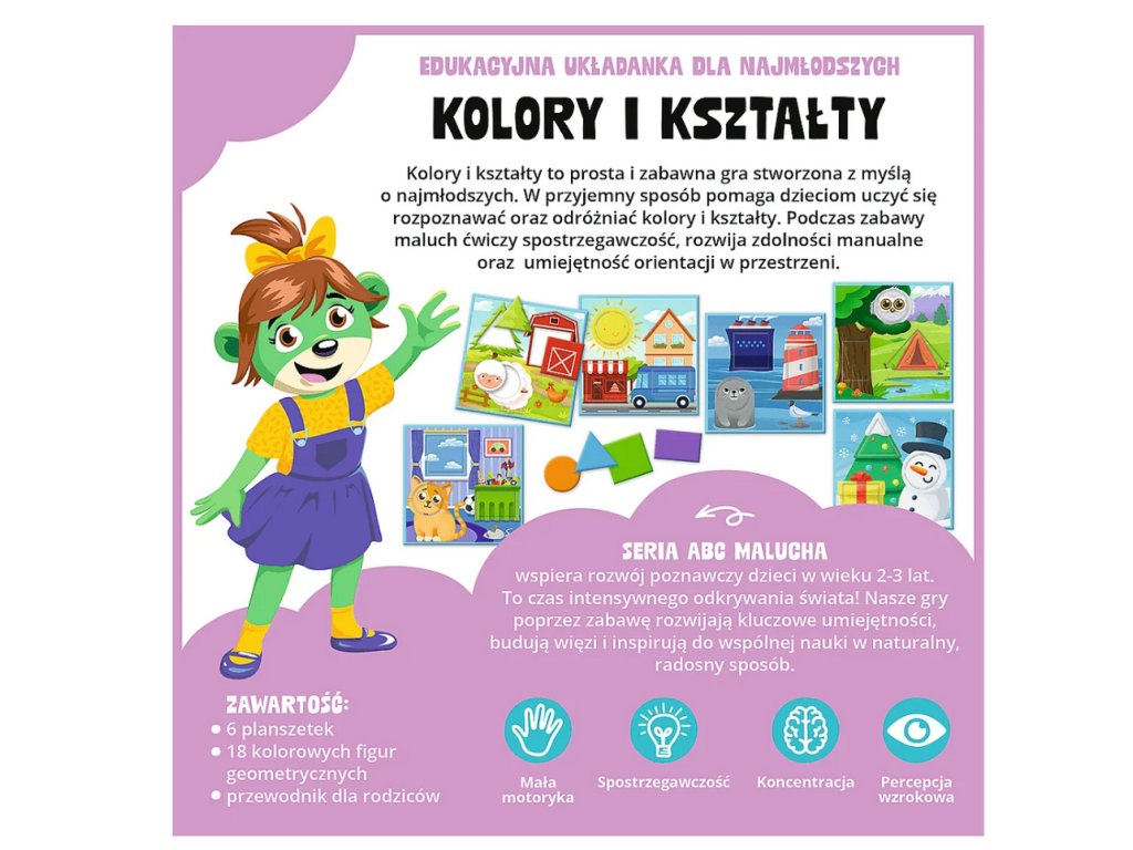 Objevte fascinující svět barev a tvarů s naší vzdělávací hrou Kolory i kształty z edice ABC Malucha. Tato hra, která patří do populární série Rodina Trefliků, je perfektním nástrojem pro rozvoj dětské kreativity a logického myšlení. Vyrobeno z odpovědně získaného materiálu s certifikací FSC Mix 70%, tato hra zajišťuje nejen zábavu, ale také ohleduplnost k naší planetě.