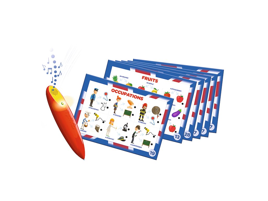Vrhněte se do jazykového dobrodružství s magickou tužkou! Naučte se názvy profesí, pojmenujte oblíbené ovoce a objevte názvy místností, které se nacházejí ve vašem domě!