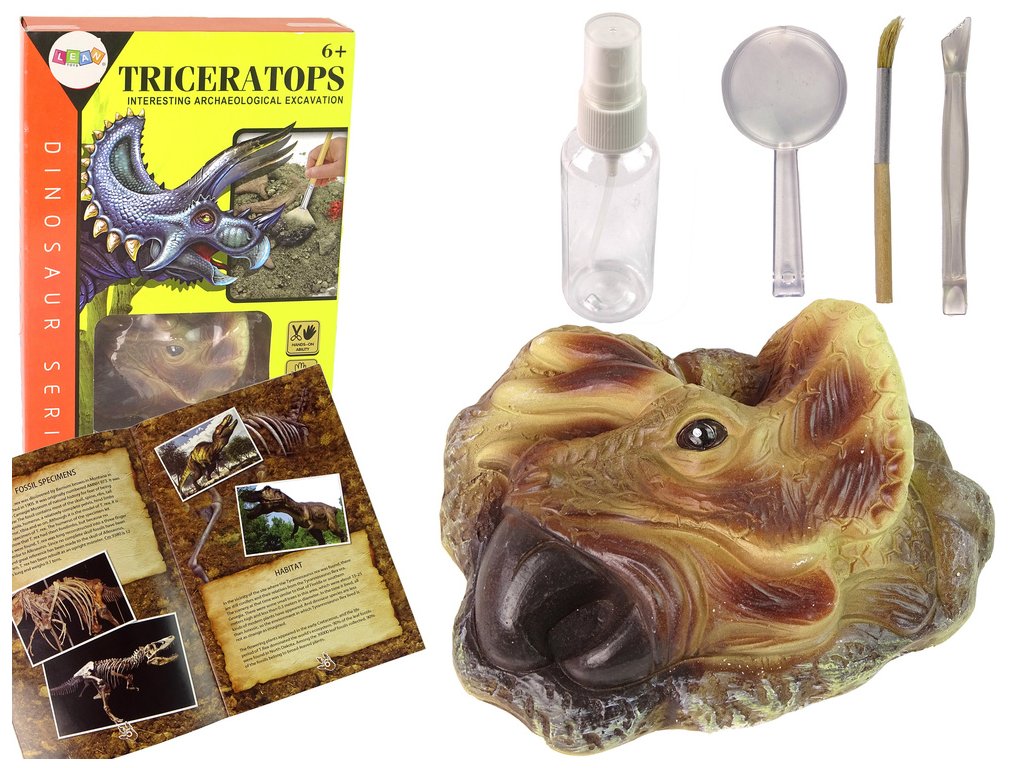 Vzdělávací sada Dinosaurus Triceratops Pozvěte své děti do fascinujícího světa dinosaurů s naší vzdělávací sadou: Dinosaurus Triceratops V sadě najdete všechny nástroje, které malý archeolog potřebuje: realistickou fosilii triceratopse o rozměrech 14 cm x 11 cm, láhev na vodu, přesný kartáček na jemný prach, lupu a nástroj na kopání