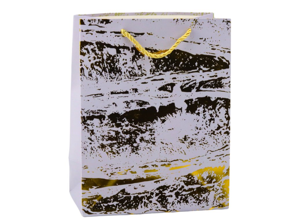 Stylová dárková taška se zlatými ozdobami Elegantní dárková taška v odstínech šedé, zdobená zlatým, nepravidelným vzorem, představuje stylové a nadčasové balení na dárek, které samo o sobě zaujme pohled a zdůrazní… Jemné zlaté akcenty krásně září na světle, přidávají celkovému vzhledu luxusní, moderní styl, který jistě udělá dojem na obdarovanou osobu
