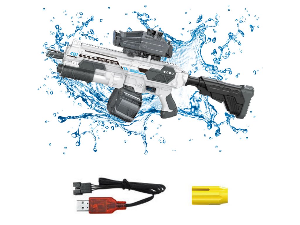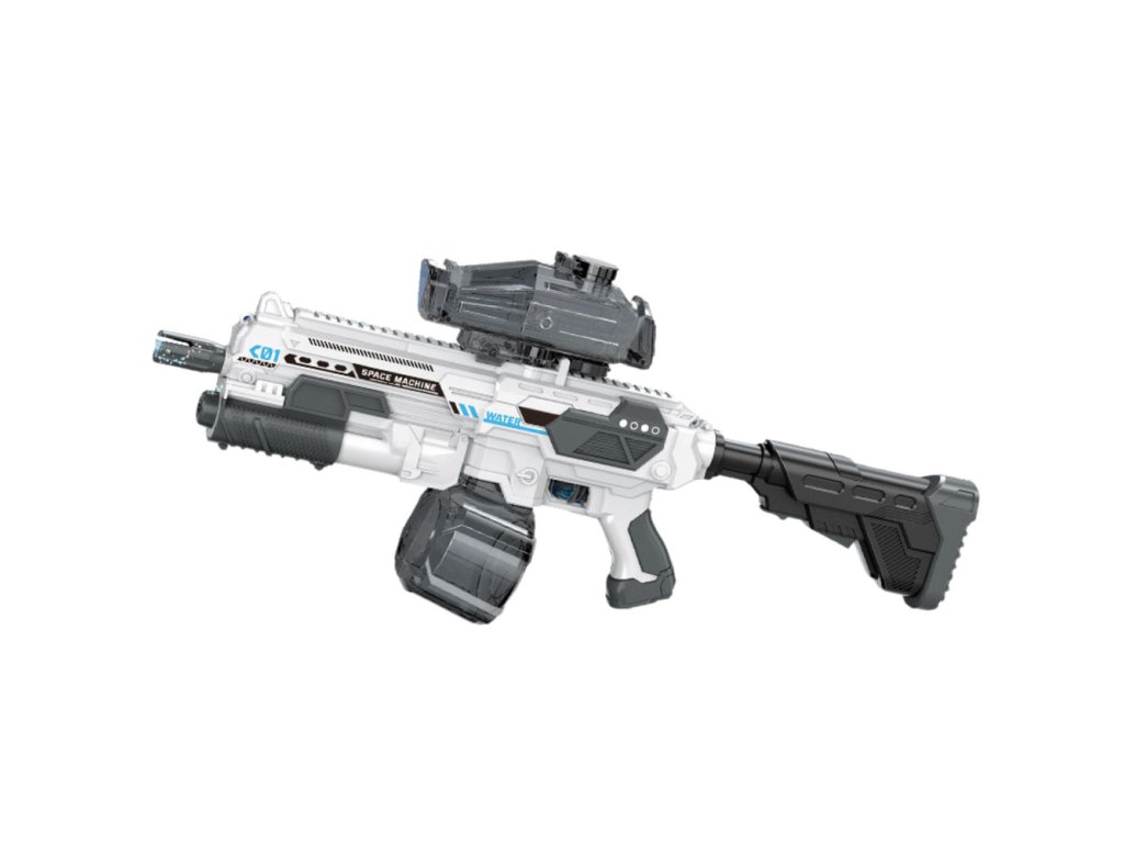 Elektrická kosmická vodní pistole M16 v bílo-šedé barvě je moderní a dynamickou hračkou, která dětem poskytne spoustu radosti a vzrušujících okamžiků během letních dobrodružství.