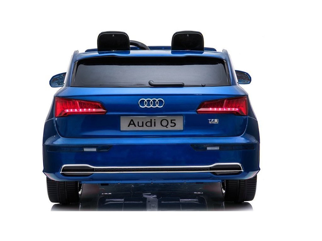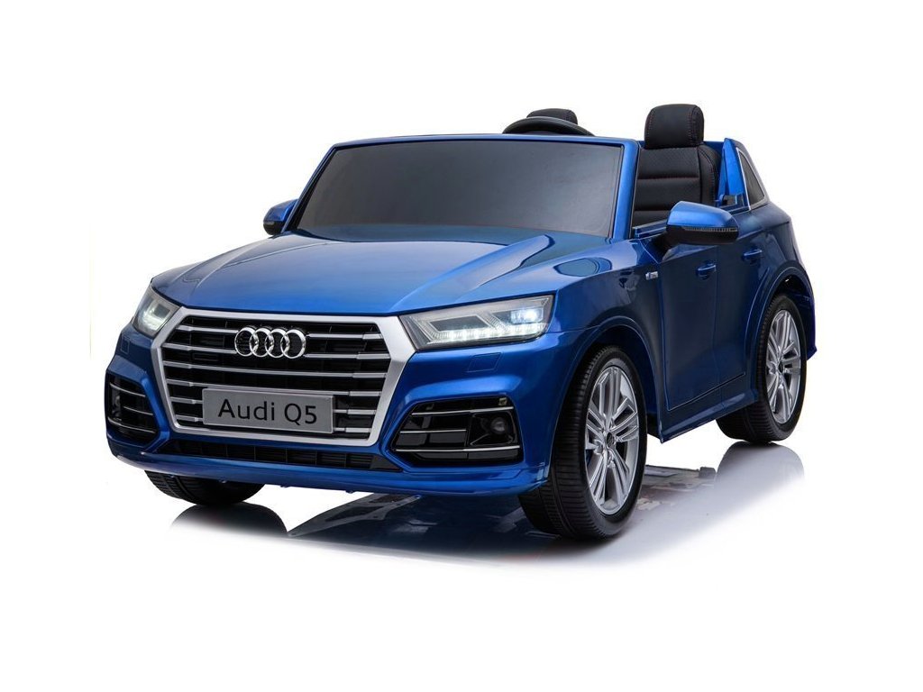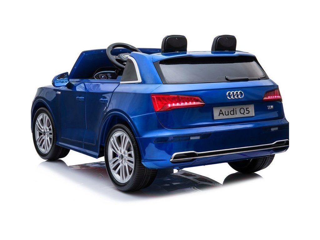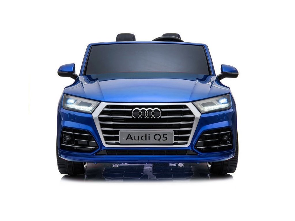 - Klasické dvoumístné modré Audi Q5 pro děti je poháněno akumulátorem a má originální licenci koncernu, díky čemuž je zdobívýrobce v přední a zadní části a na volantu