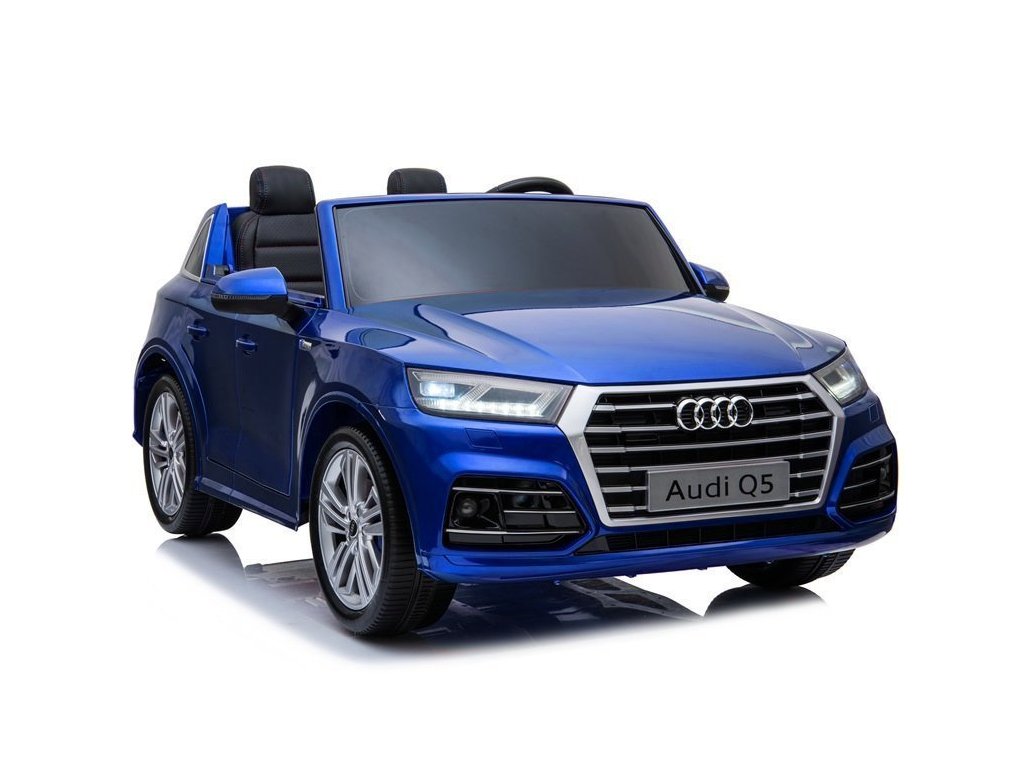 - Klasické dvoumístné modré Audi Q5 pro děti je poháněno akumulátorem a má originální licenci koncernu, díky čemuž je zdobí logo výrobce v přední a zadní části a na volantu