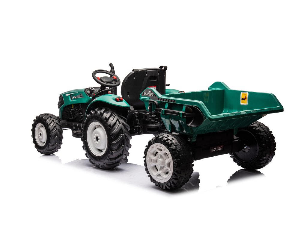 - Elektrický traktor HC-306 s přívěsem v tmavě zelené barvě nabízí jedinečný zážitek pro malé milovníky traktorů