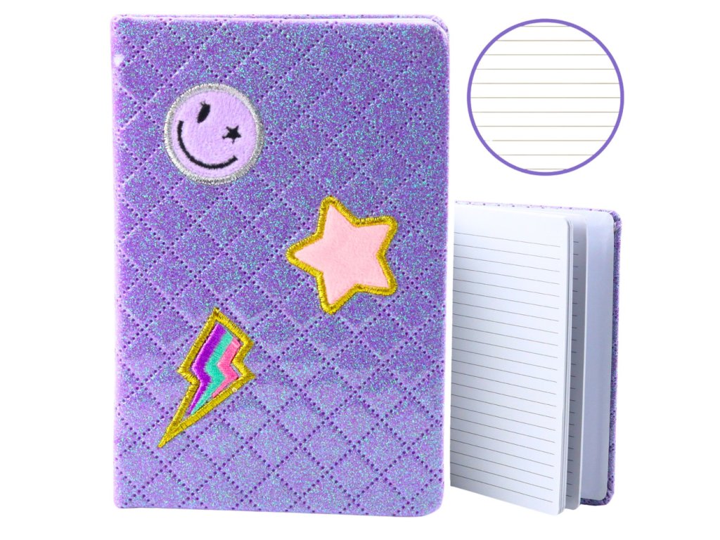 Fialový třpytivý zápisník s nášivkami B6, 80 listů