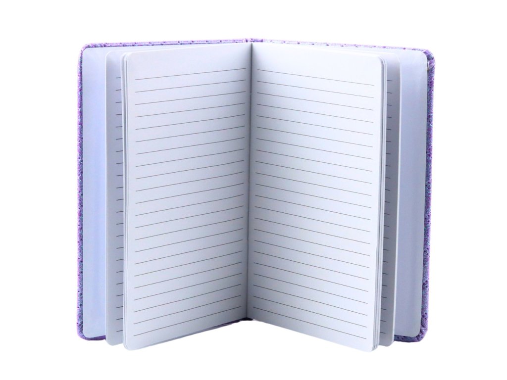 Stylový zápisník ve formátu B6 s brokátovým, fialovým obalem je praktický a estetický nástroj pro každodenní zápisky Povrch obálky je pokryt hladkým, laminovaným materiálem, díky čemuž se třpytky neosypávají a zůstávají odolné i při intenzivním používání