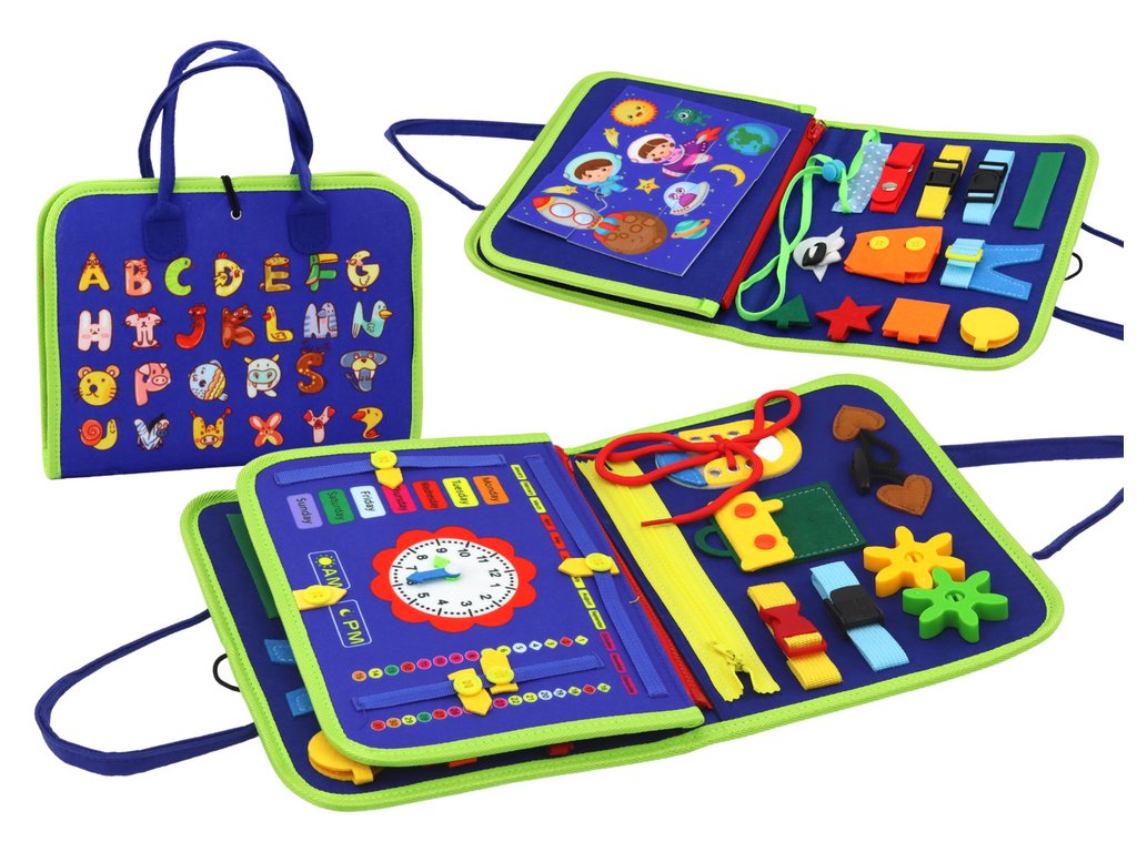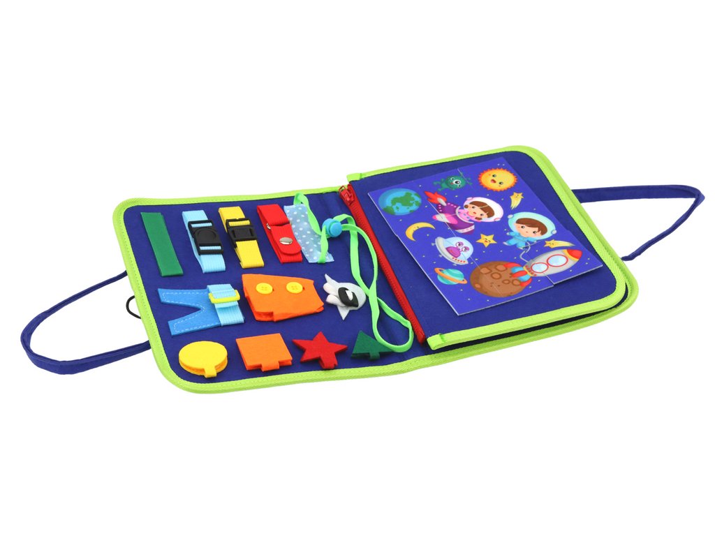 SENZORICKÁ VÝUKOVÁ TABULE Z FILCU Senzorická tabule je inovativní hračka, která rozvíjí manuální a kognitivní dovednosti dítěte prostřednictvím interaktivních prvků přizpůsobených malým ručkám Díky rozmanitým manipulačním úkolům, jako jsou posuvníky, knoflíky, hodiny, tkaničky nebo spony, se děti učí motorické koordinaci a samostatnosti při provádění každodenních činností