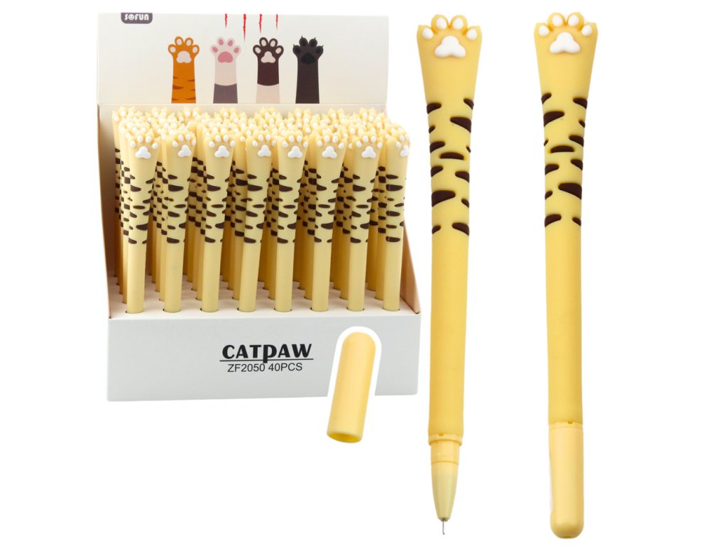 - Gelové pero Kočičí Tlapa v žluté variantě s hnědými pruhy je dokonalým spojením komfortu psaní a originálního, zábavného vzhledu