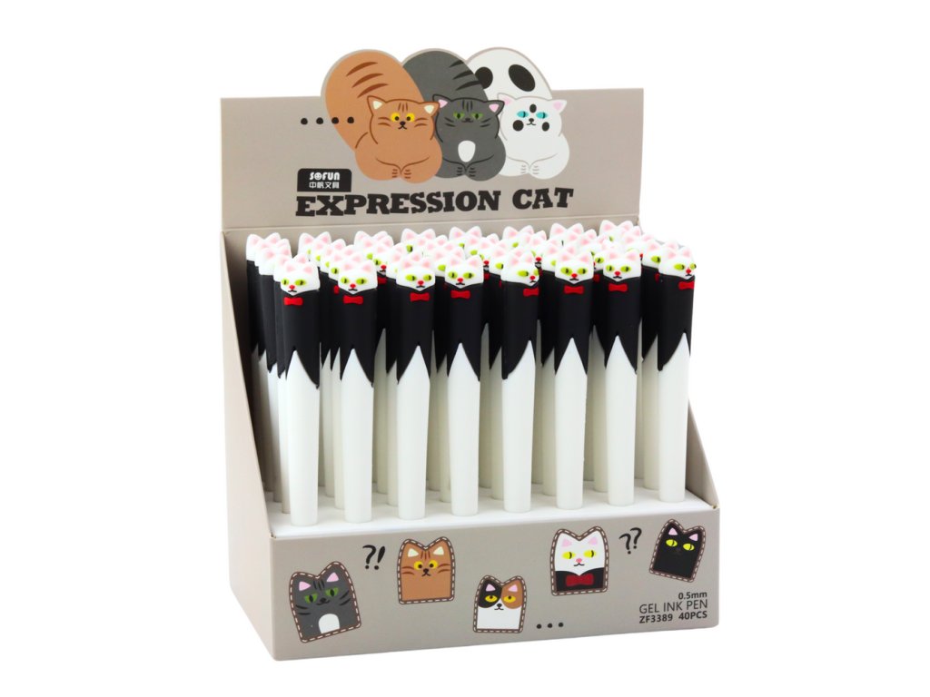 Opláštění je vyrobeno z měkké, pružné gumy, která je příjemná na dotek a odolná, zatímco výrazný výraz kočky dodává každému kusu osobitý charakter Toto pero je vybaveno modrým gelovým inkoustem, který zajišťuje hladké a přesné psaní, ideální pro každodenní použití