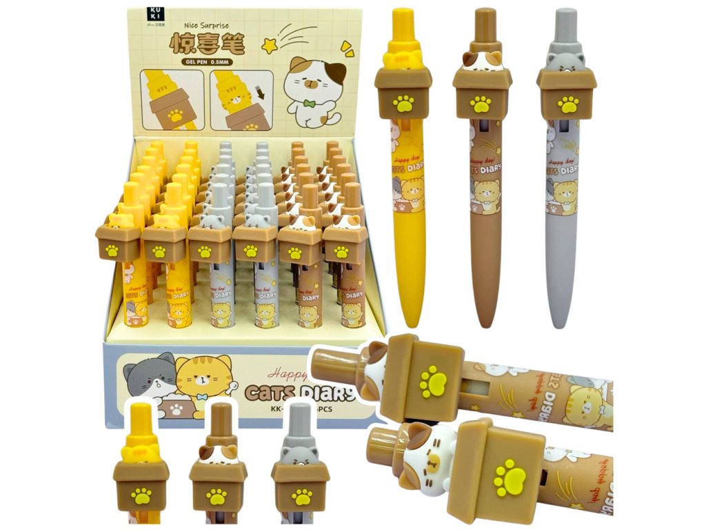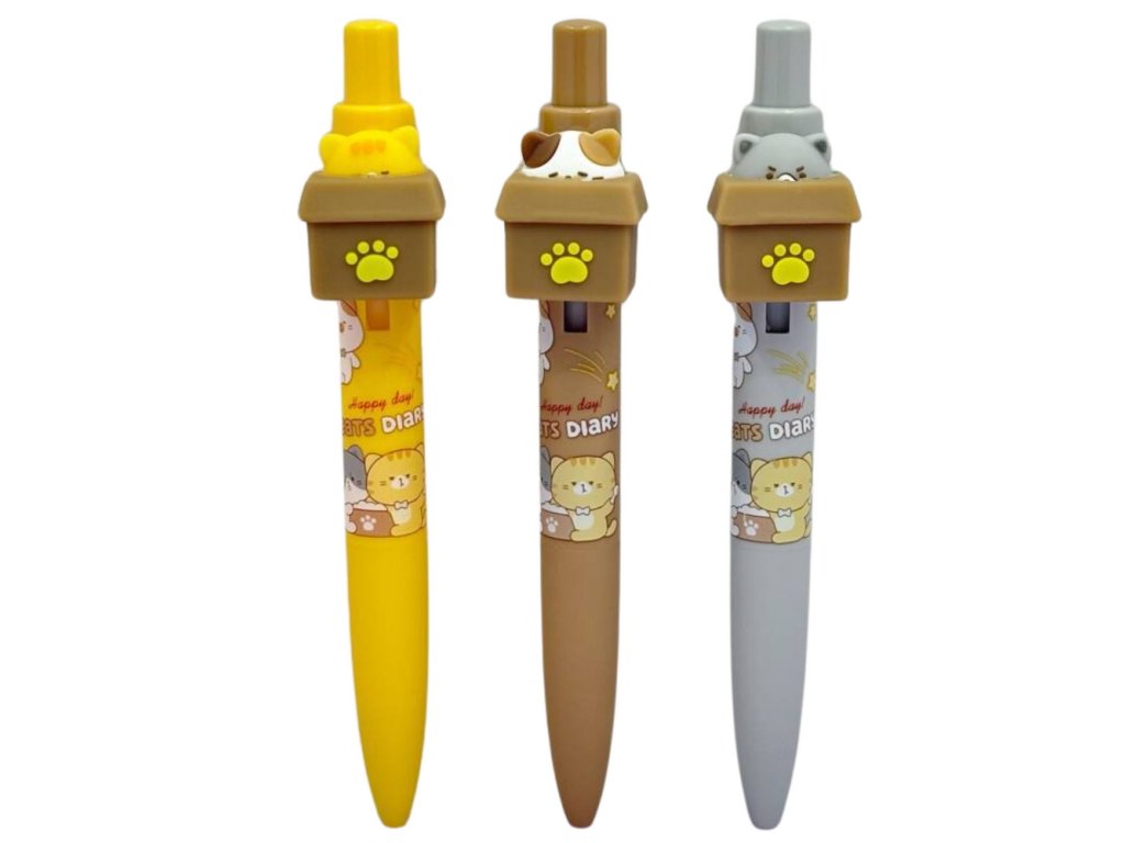 - Originální design: Toto pero se vyznačuje trojrozměrným prvkem představujícím kočičí tvář, která vykukuje z krabičky při každém kliknutí, což poskytuje nejen praktické, ale i zábavné posunovače