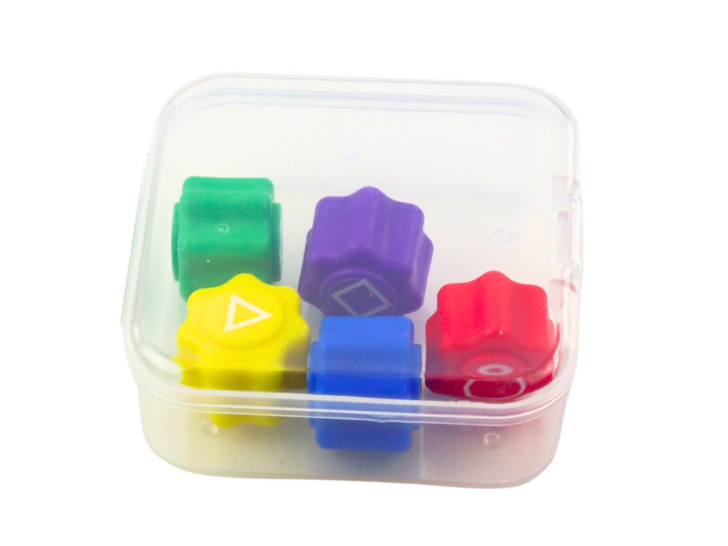 - Tento set obsahuje 5 kostek v živých a intenzivních barvách: červená, fialová, modrá, zelená a žlutá