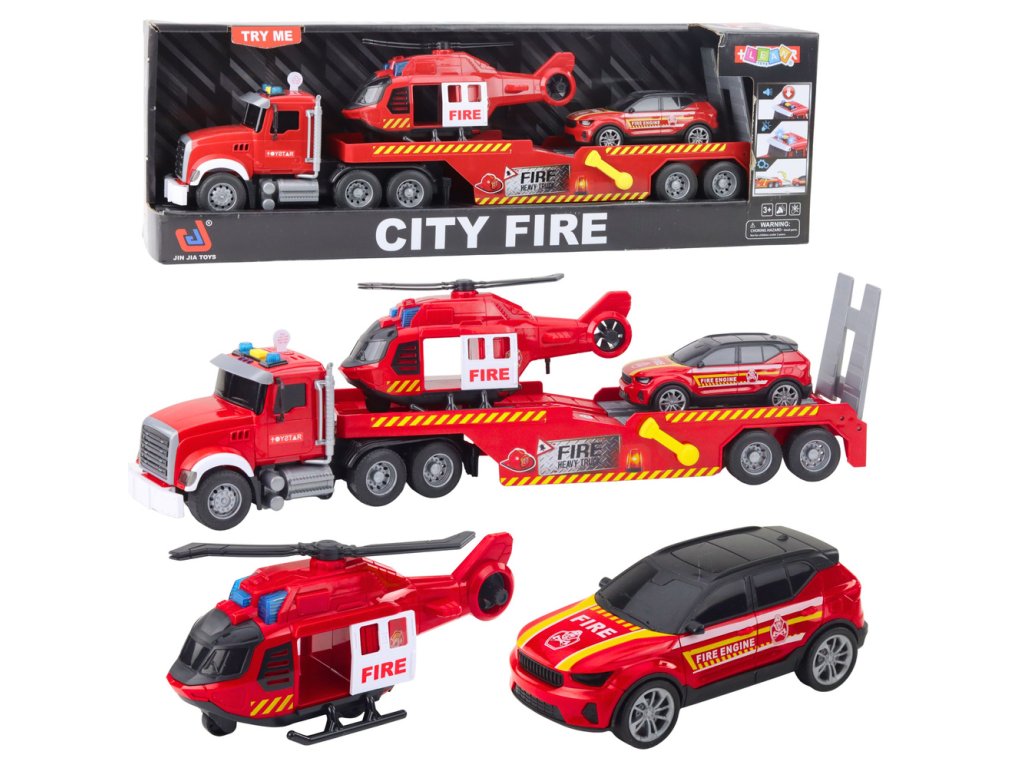 Náklaďák s návěsem je vybaven zvedací platformou, díky níž lze snadno nakládat a vykládat hasičské auto. Vrtulník má kola pro pohyb po povrchu jako pozemní vozidlo. Pro ještě větší zábavu a realističnost jsou k dispozici světelné a zvukové efekty, které se aktivují pomocí tlačítek.