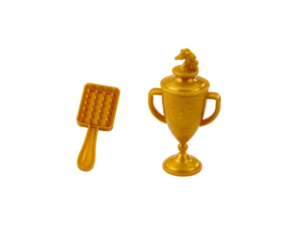 - V balení se nachází také elegantní zlatý pohár, který může dítě udělit svému koni za úspěšný výkon, kartáč pro péči o hřívu a dále sedlo a uzda, které umožňují připravit koně na vystoupení, vyjížďky nebo soutěže