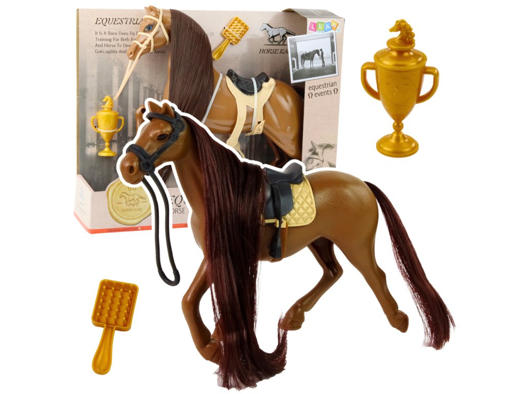 Hnědý kůň s dlouhou hřívou s příslušenstvím – sedlo, pohár, kartáč