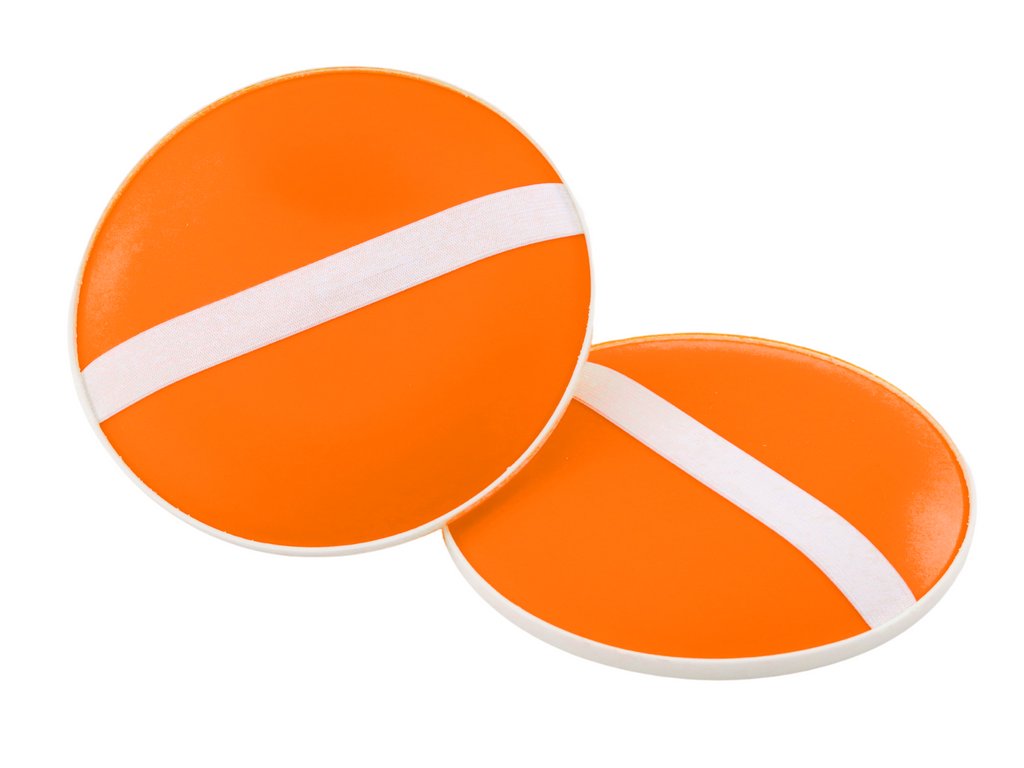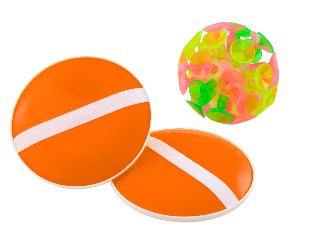 - Tento set zahrnuje jeden míček s přísavkami a dvě oranžové kulaté paletky, které mají speciální povrch pro chytání