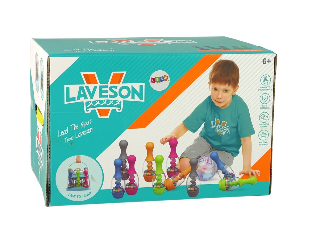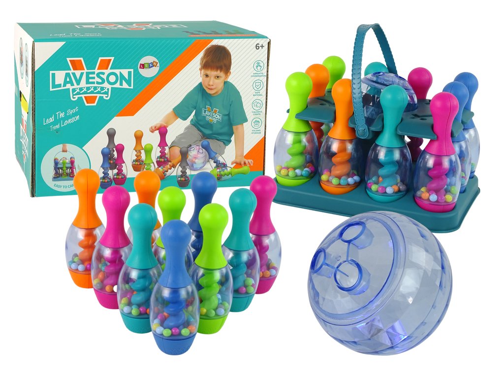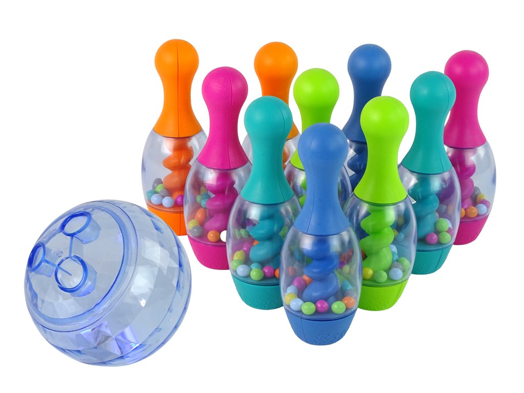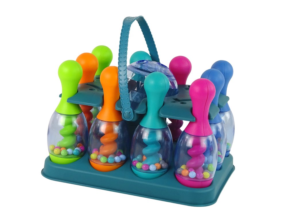 Součástí sady je 10 kuželek, koule a praktický stojan, který umožňuje pohodlné ukládání všech prvků. Kuželky s výškou 20 cm jsou plněné barevnými kuličkami, které při každém zásahu vydávají chrastící zvuky. Koule s průměrem 12 cm se při hodu třpytí barevnými vzory, což přidává na atraktivitě a upoutává pozornost dětí. Všechny komponenty jsou vyrobeny z odolného, bezpečného plastu, což zajišťuje bezpečnost při používání.