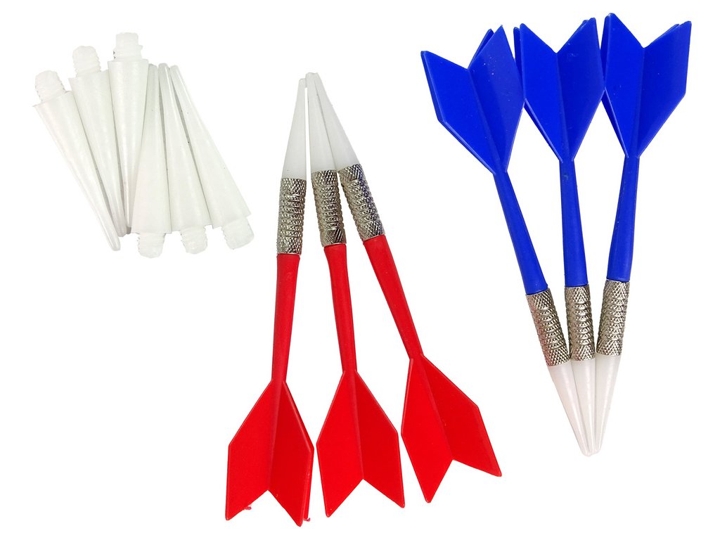 - 3 modré a 3 červené, každá s délkou 12 cm, vybavené kovovými prvky pro snadnější a pohodlnější házení