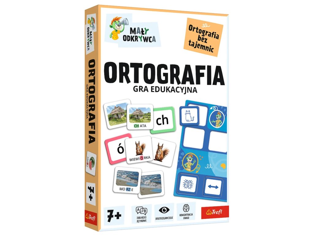 Ortografie Malý Objevitel Trefl 02803 je vzdělávací hra pro děti, která jim přátelským způsobem představuje svět složitých slov Prostřednictvím hry učí správnému psaní slov s pravopisnými obtížemi