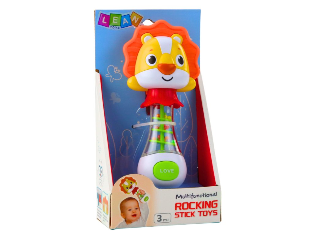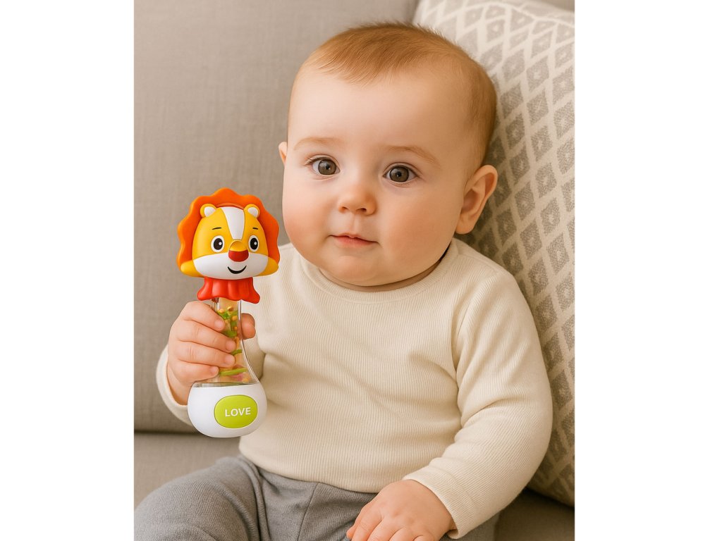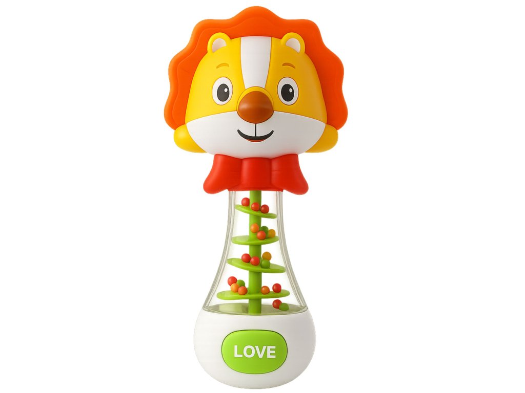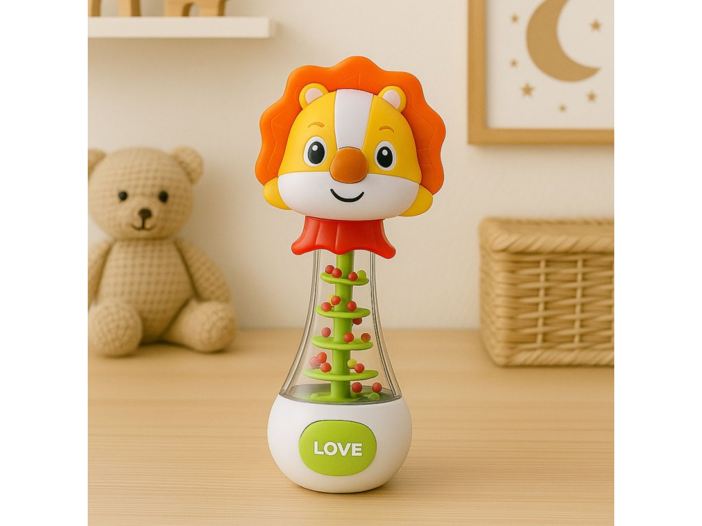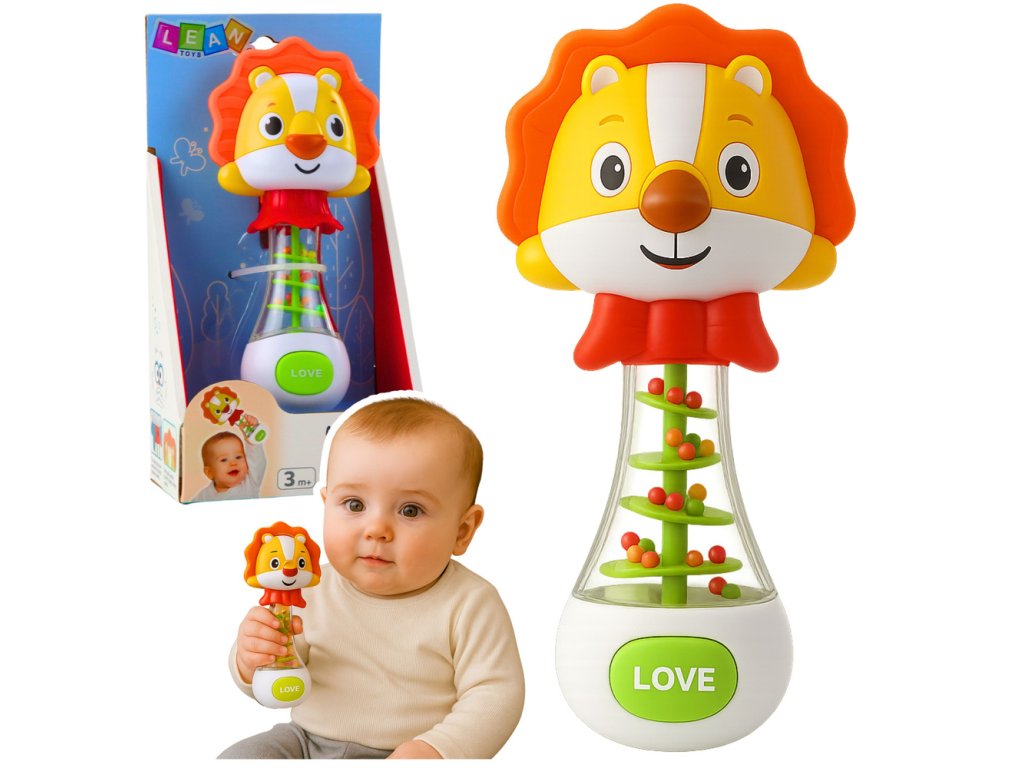 Grzechotka Zabawka Dla Niemowlaka Lew s Barevnými Kuličkami je dokonalou volbou pro vaše nejmenší! Tato barevná, bezpečná a funkční hračka okamžitě upoutá pozornost každého miminka díky svému atraktivnímu designu a výrazným barvám. Uvnitř průhledné části se nacházejí barevné kuličky, které se při třeštění pohybují a vydávají jemný zvuk, který podporuje senzorický rozvoj dítěte stimulací jeho sluchu a zraku. Grzechotka má navíc speciální tvar přizpůsobený malým dětským ručkám, což zajišťuje pohodlné a jisté uchopení. Díky zaobleným hranám, lehké konstrukci a použití bezpečných materiálů je hračka ideální pro každodenní aktivity a zajišťuje bezpečnost vašeho dítěte.
