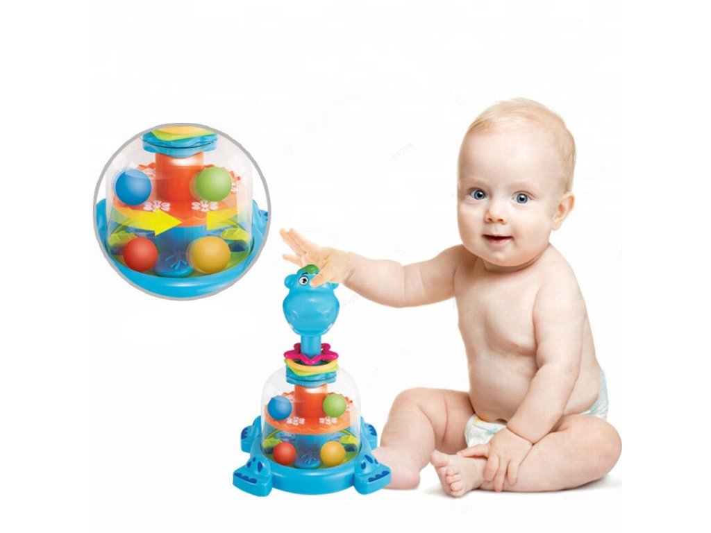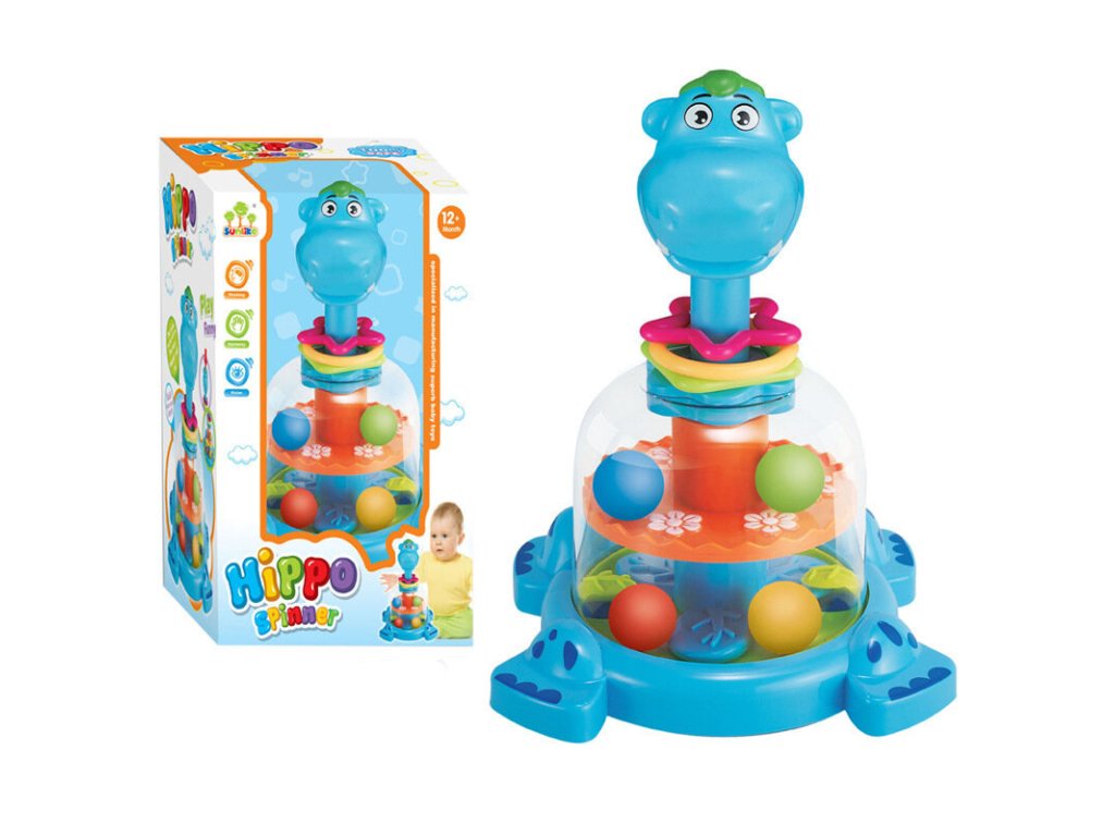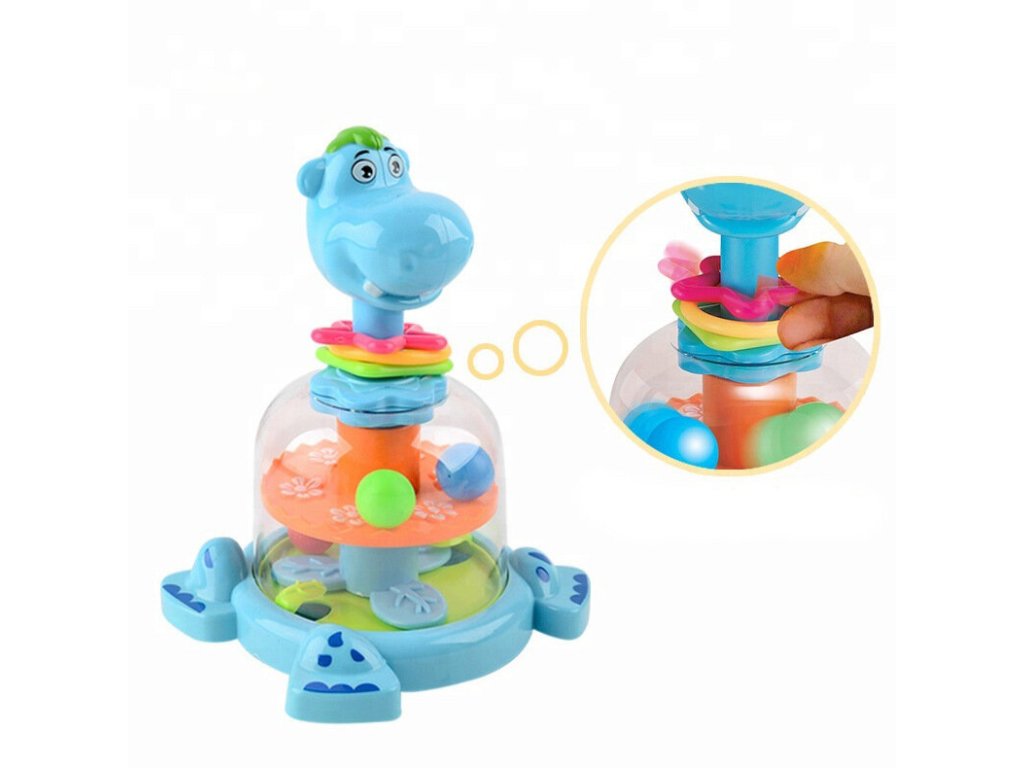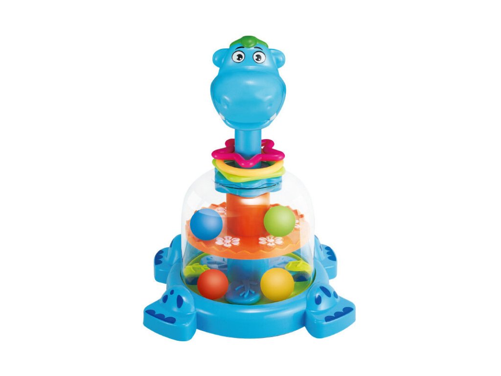 - Když stisknete hlavu hrošíka, uvnitř se roztáčí kolo s barevnými kuličkami, které tančí a skáčou, zaujmou a baví každého malého objevitele